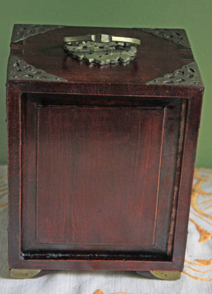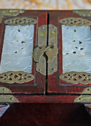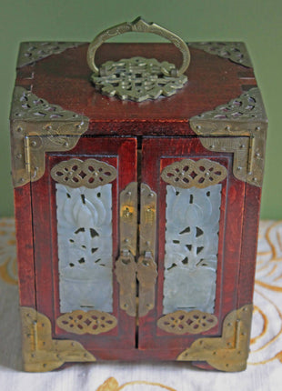 Hand Made Wooden Jewelry Cabinet with Drawers. Box with Jade Inserts on Doors, Brass Hardware and Handle. Vintage Mini Cabinet.