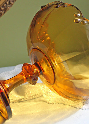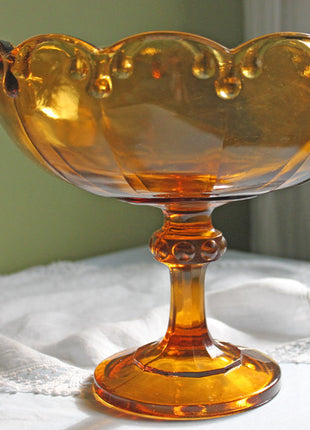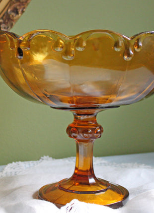 Amber Glass Compote or Candy Bowl with Tear Drop Design. It is large, footed with scalloped rim and ornate stem.... Read More