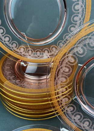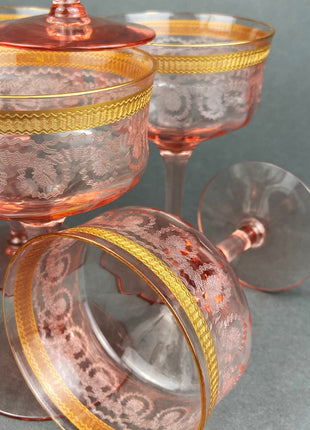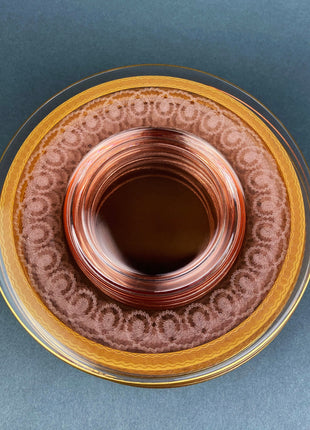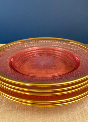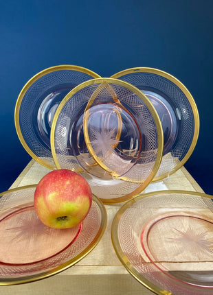 Antique Etched Pink Glass Dessert/Salad Plates With Gold Rims. Set of Five. Etched Star & Waffle Brim. Holiday Dining. Fine Dining.