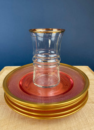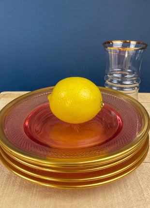 Antique Etched Pink Glass Dessert/Salad Plates With Gold Rims. Set of Five. Etched Star and Waffle Brim. Rare Collectibles. Holiday... Read More