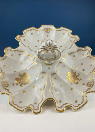 Three Section Divided Porcelain Bowl with Handle in Center. Antique Limoges Divided Dish with Scalloped Rim. Stunning Gold Floral Motif. Very Fine Porcelain Made in France. Wedding Gift. Cottagecore Living. Table Centerpiece. Marked by Manufacturer. Very Rare Finding. Excellent Condition.