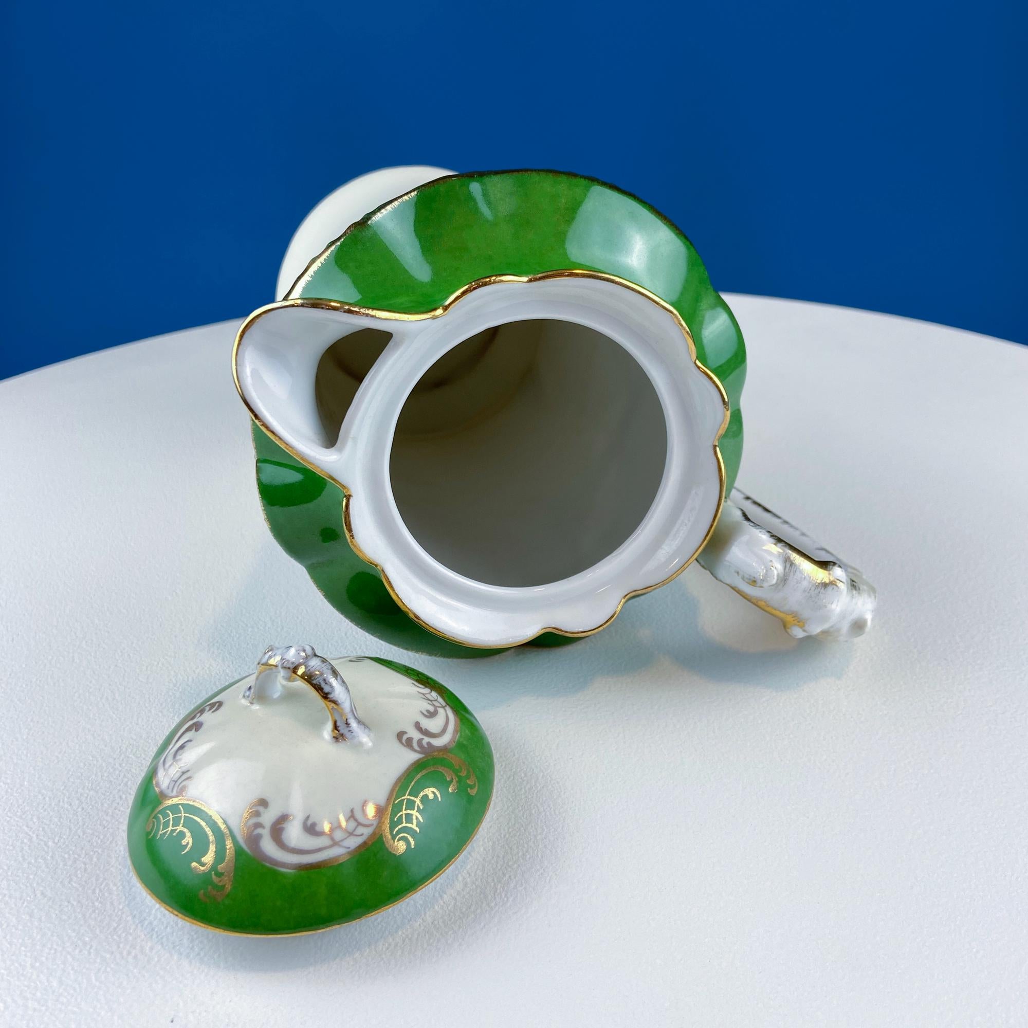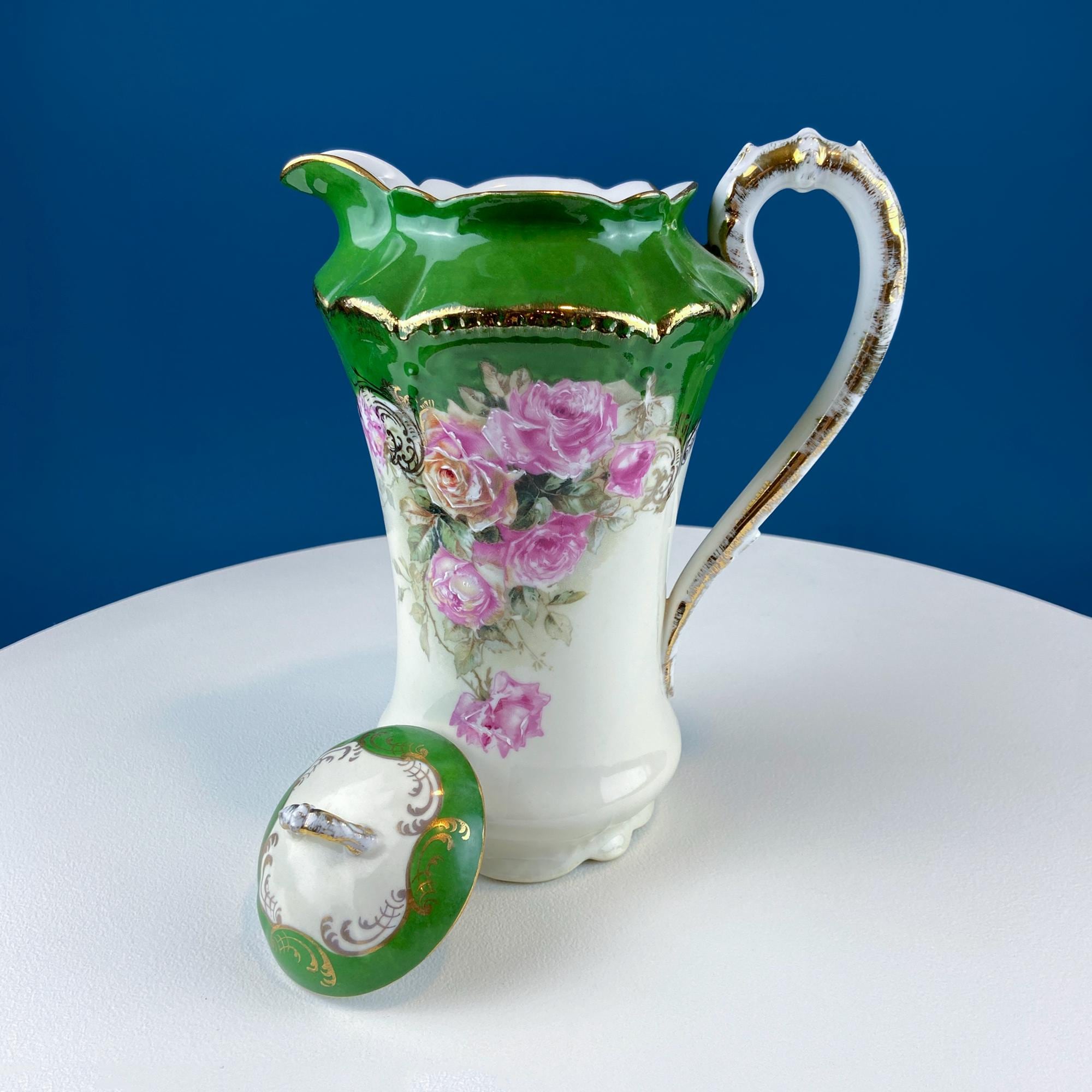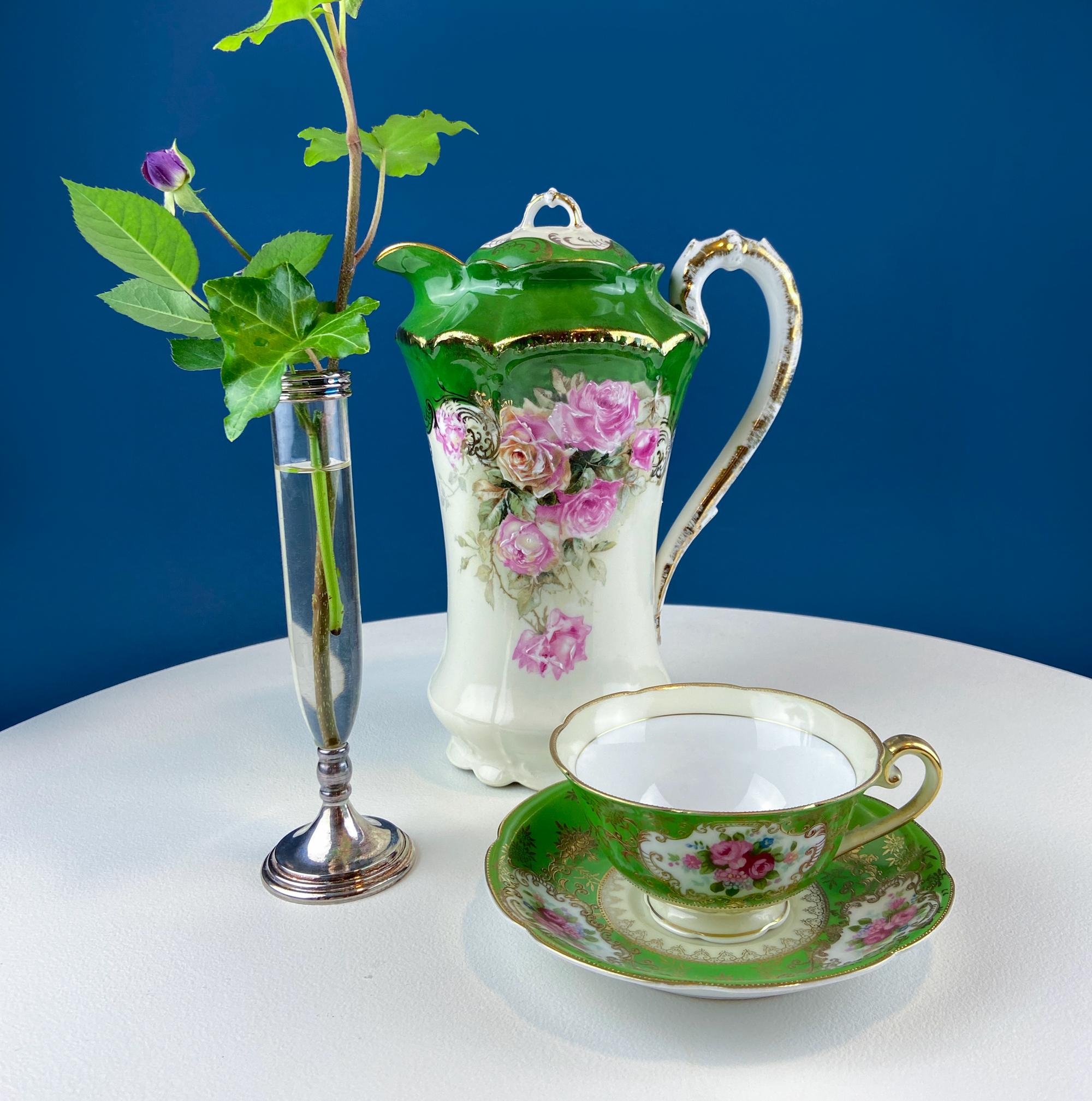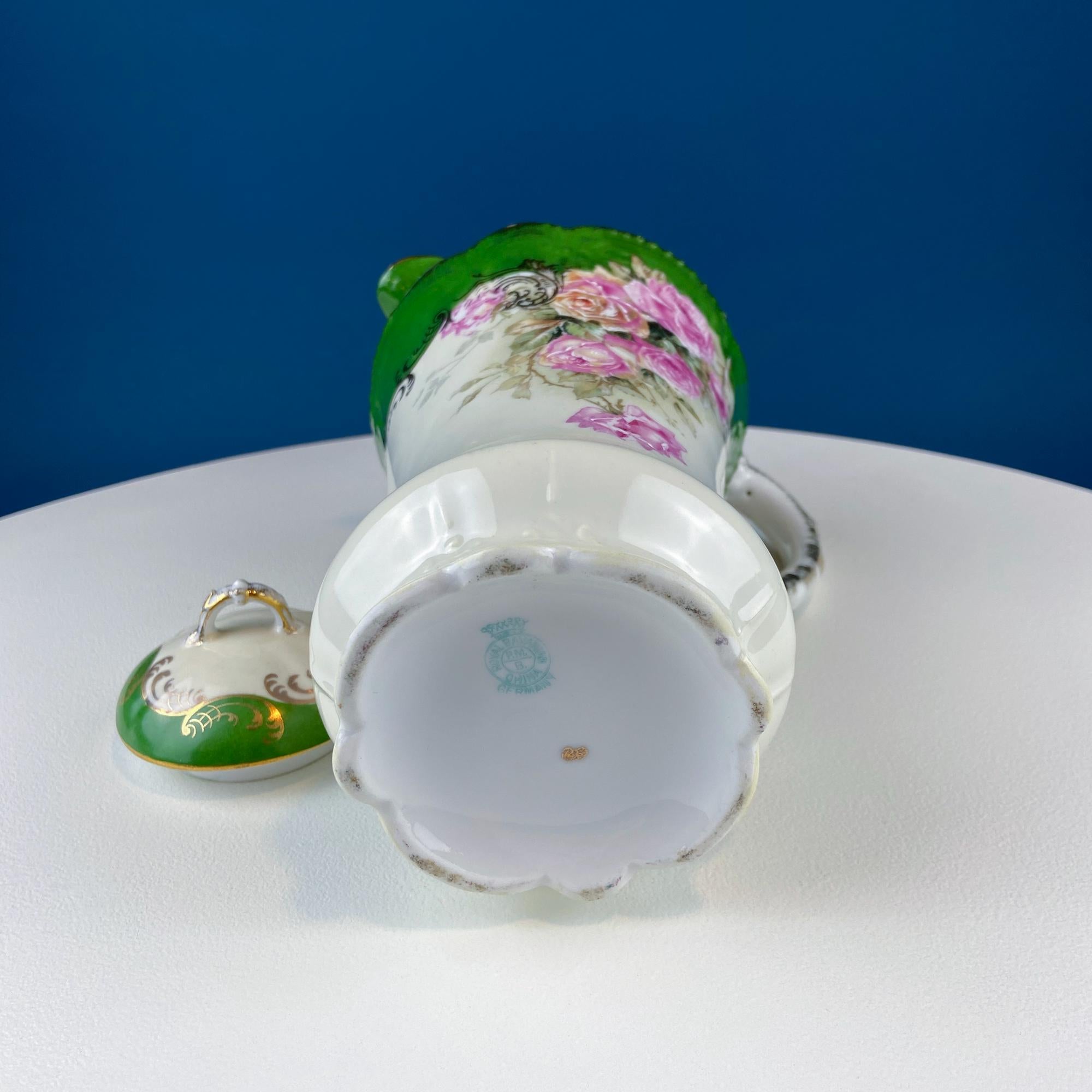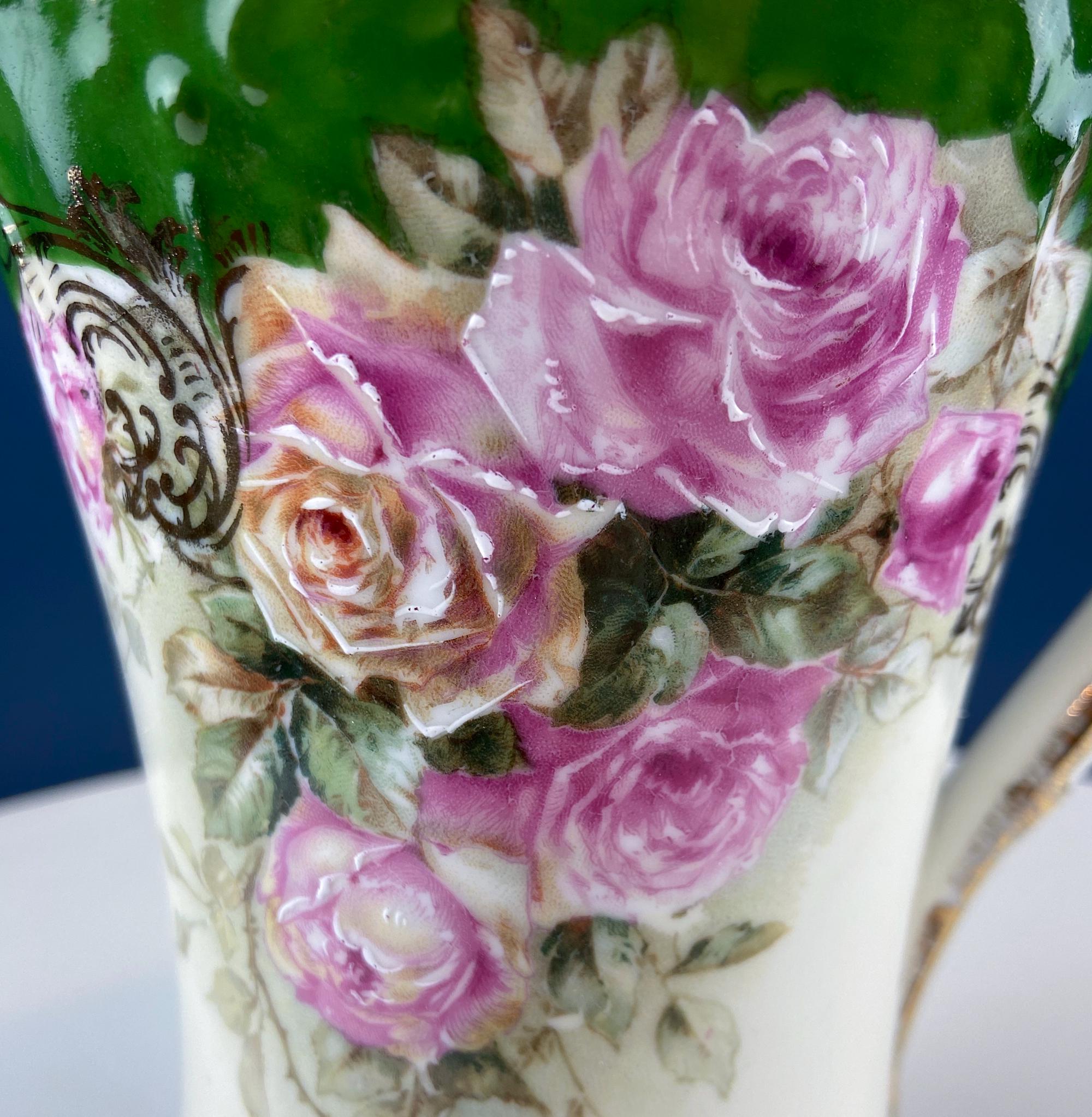 Antique Royal Bavarian Coffee Pot. Unusual Green with Pink Hand Painted Roses. Curvilinear Art Nouveau Silhouette. Dining Room Decor. Gift... Read More