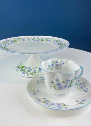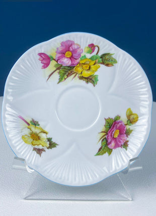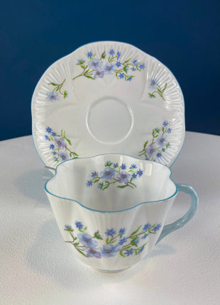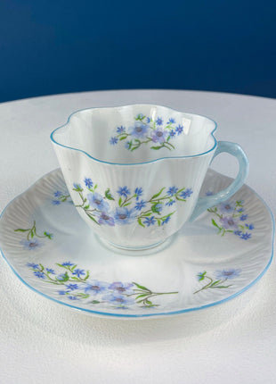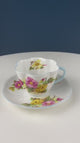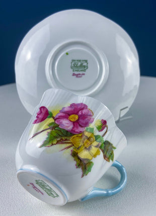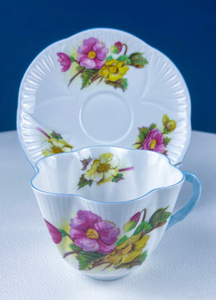 Antique Shelley Cup and Saucer with Begonia Motif . Beautiful, Fine Porcelain. Colorful Flowers and Blue Handle. French Country Living.