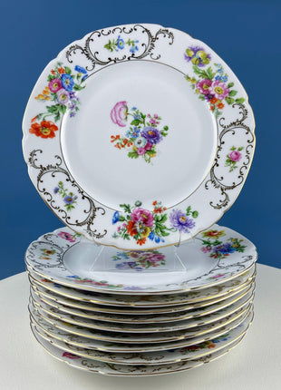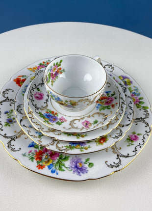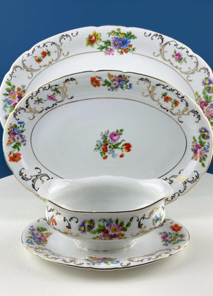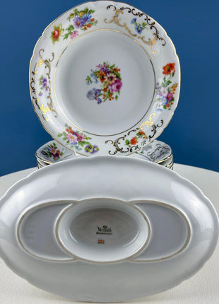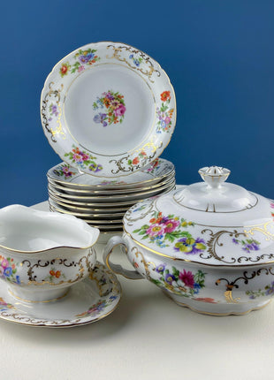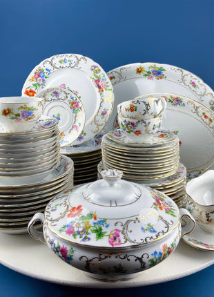 Antique Victoria Czechoslovakia 56 Piece Dish Set. French Country Living. Modern Country. Dining Room Table Decor. 10 Dinner Plates, 8 Salad Plates, 11 Dessert Plates, 10 Berry or Dessert Bowls, 10 Soup Plates, 3 Cups and Saucers, Sauce or Chocolate Boat with Plate, 2 Serving Platters, Soup Tureen. Gift for Him or Her. Wedding Registry. Excellent Condition. Marked by the Manufacturer.