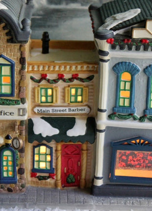 Christmas Decoration by St. Nicholas Square. Post Office, Barber Shop, and Art Gallery. Hand Painted Porcelain House with Light Kit. Village Collection. Large hand painted porcelain building with many beautiful details and a light kit. Excellent vintage condition. Marked by manufacturer. It has original labels, and original box. Accessories shown on the box are not included. St. Nicholas Square began in 1990 and was retired in 2002. This piece is absolutely beautiful timeless Christmas decoration. It would be a great gift for a person appreciating porcelain art and tradition of celebrating Christmas. Spruce in the photo is not included in the set.