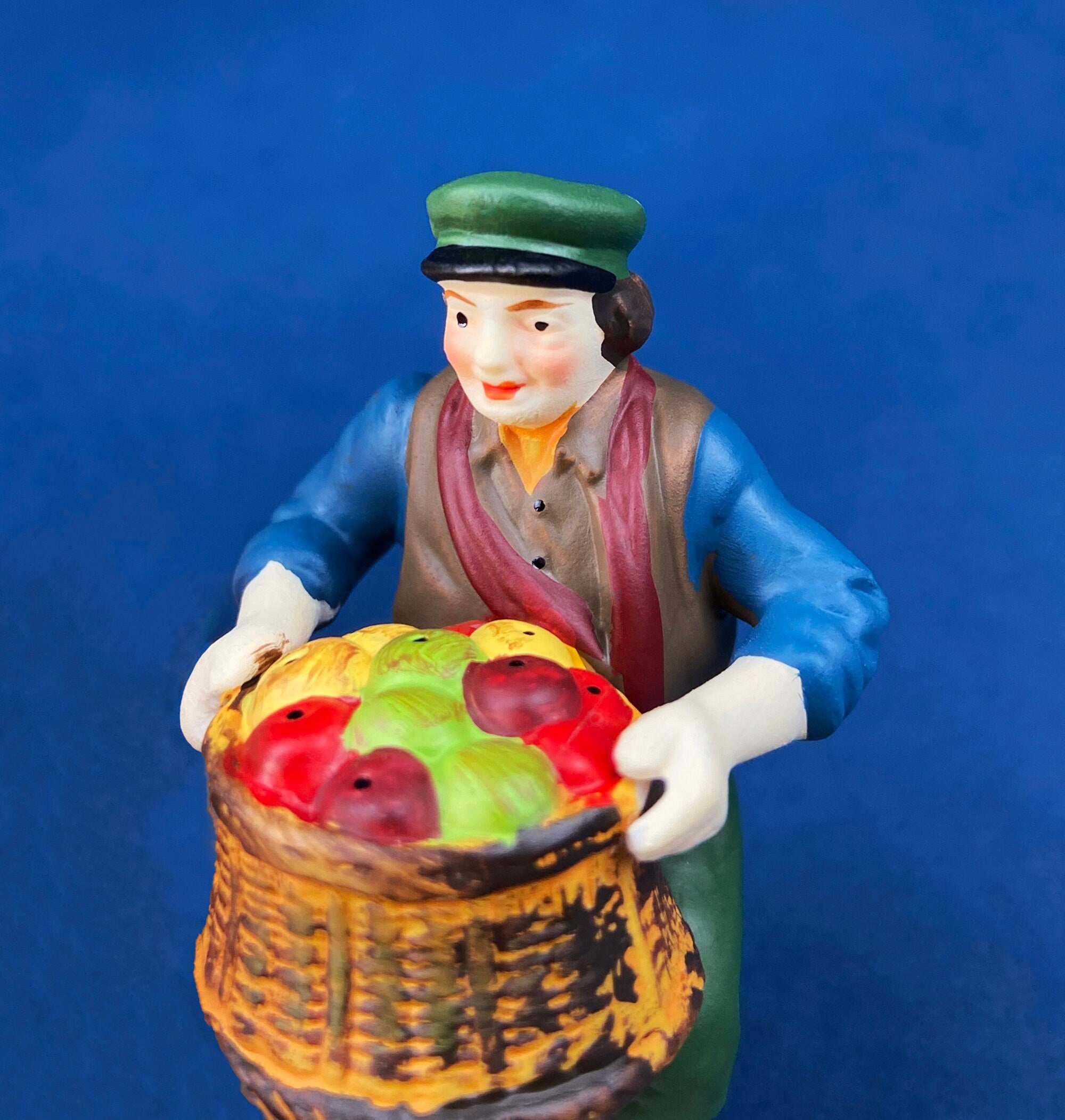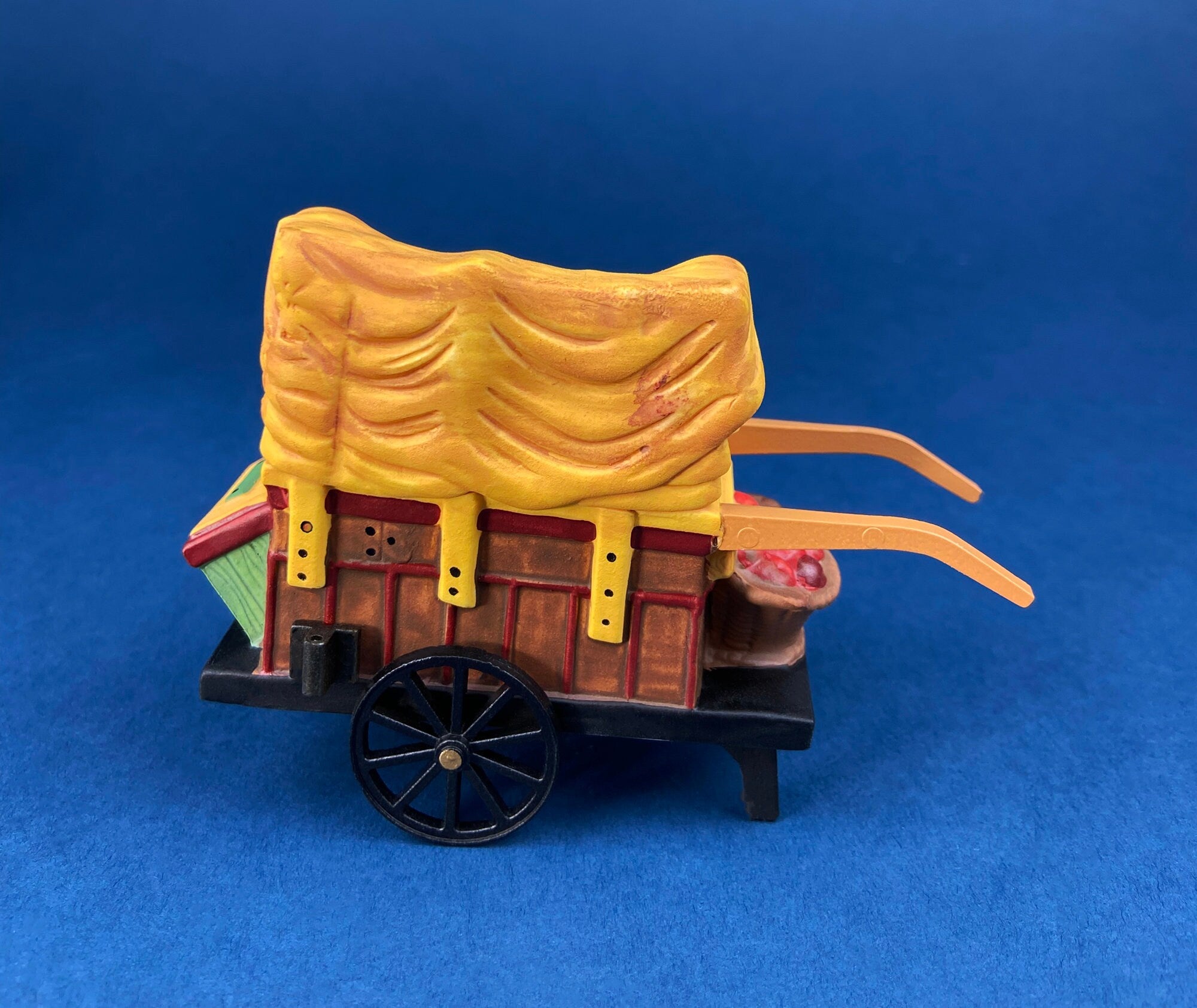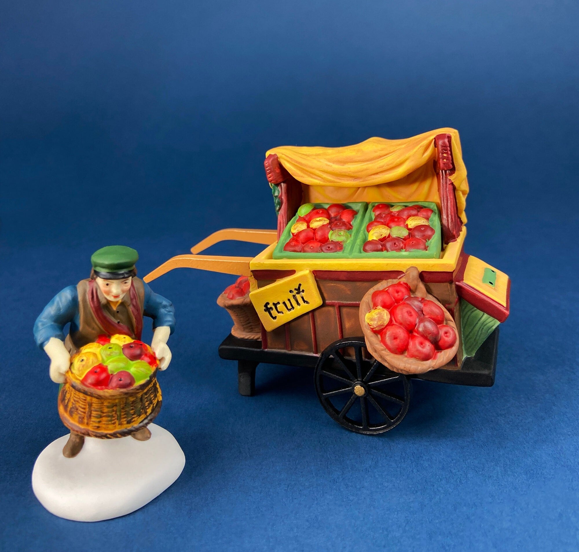 Christmas Village Accessories by Dept. 56. Porcelain, hand Painted Fruit Vendor. Chelsea Market Fruit Monger and Cart. Holiday Celebration. Lantern... Read More