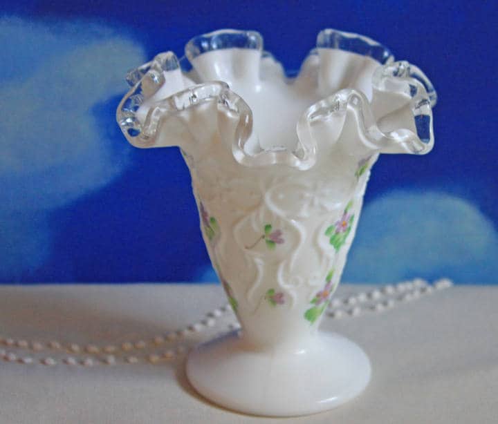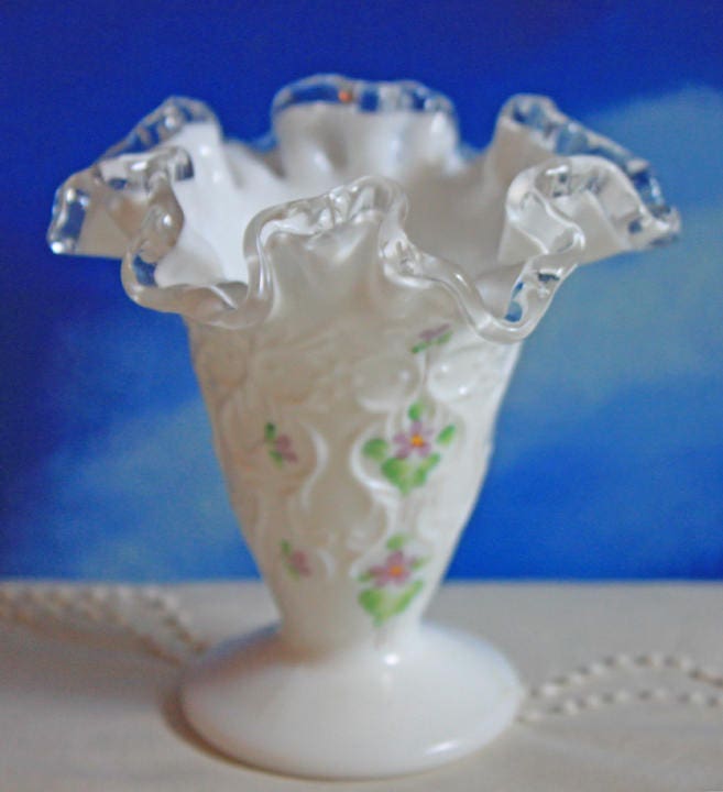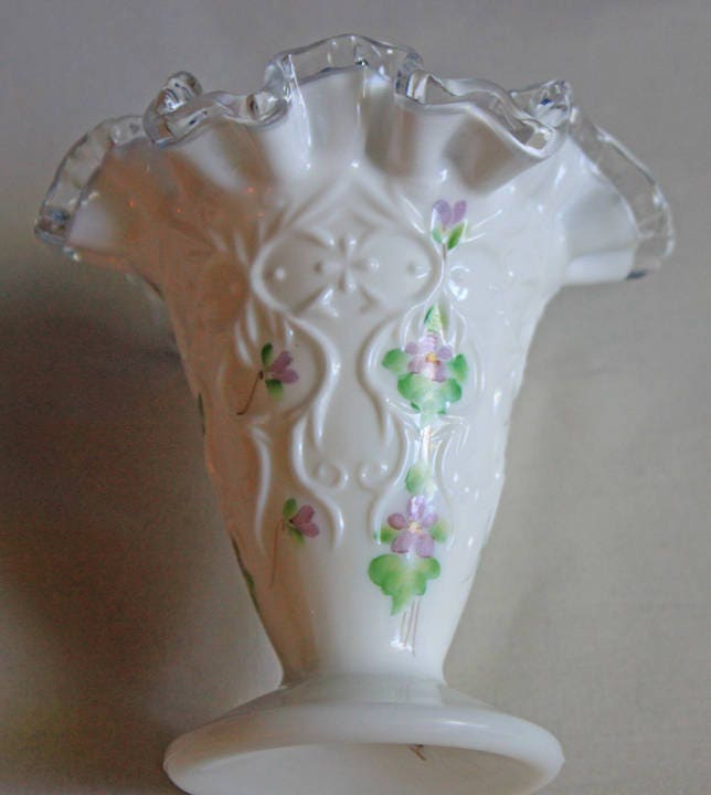 Fenton Milk Glass Vase. Cone Vase with Silvercrest Ruffled and Scalloped Rim and Hand Painted Violets. Collectible vase or wedding... Read More