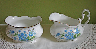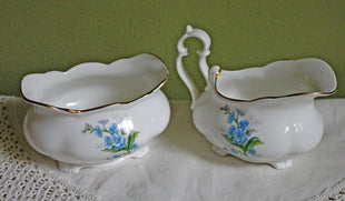 Creamer and Sugar Bowl by Royal Albert. Vintage Porcelain Sugar Bowl with Forget Me Not Floral Pattern. Dishes Made in England. Very good vintage mint condition. No chips, cracks, or crazing. Marked by manufacturer. We have some other dishes with the same pattern in our store.