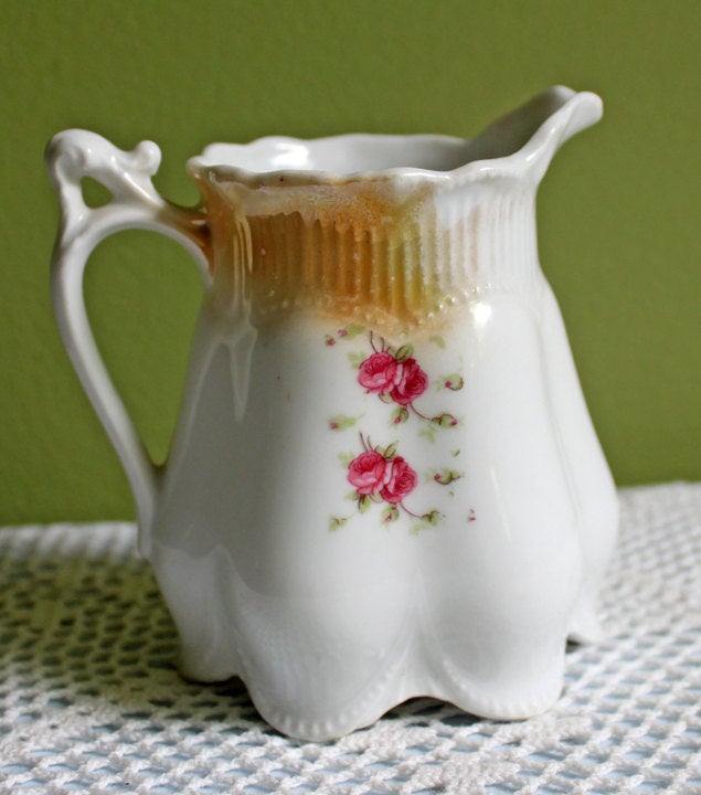Creamer. Antique Porcelain Creamer with Hand Painted Roses. Scalloped Rim and Base, and Beautiful Shape Handle. Made in Germany. Collectible... Read More