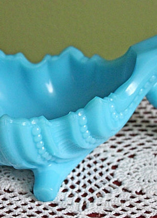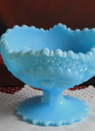 Fenton Blue Milk Glass Footed Candy Bowl or Compote. Fenton Art Glass with Pinwheel Pattern. Ornate Dish with Scalloped Rim. Marked by the manufacturer. Mint condition. Perfect gift idea. The last photo shows another Fenton blue milk glass item available in our store. Please click the link below to take a look at this.