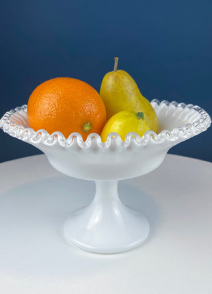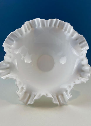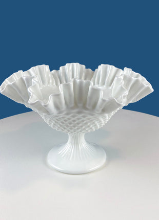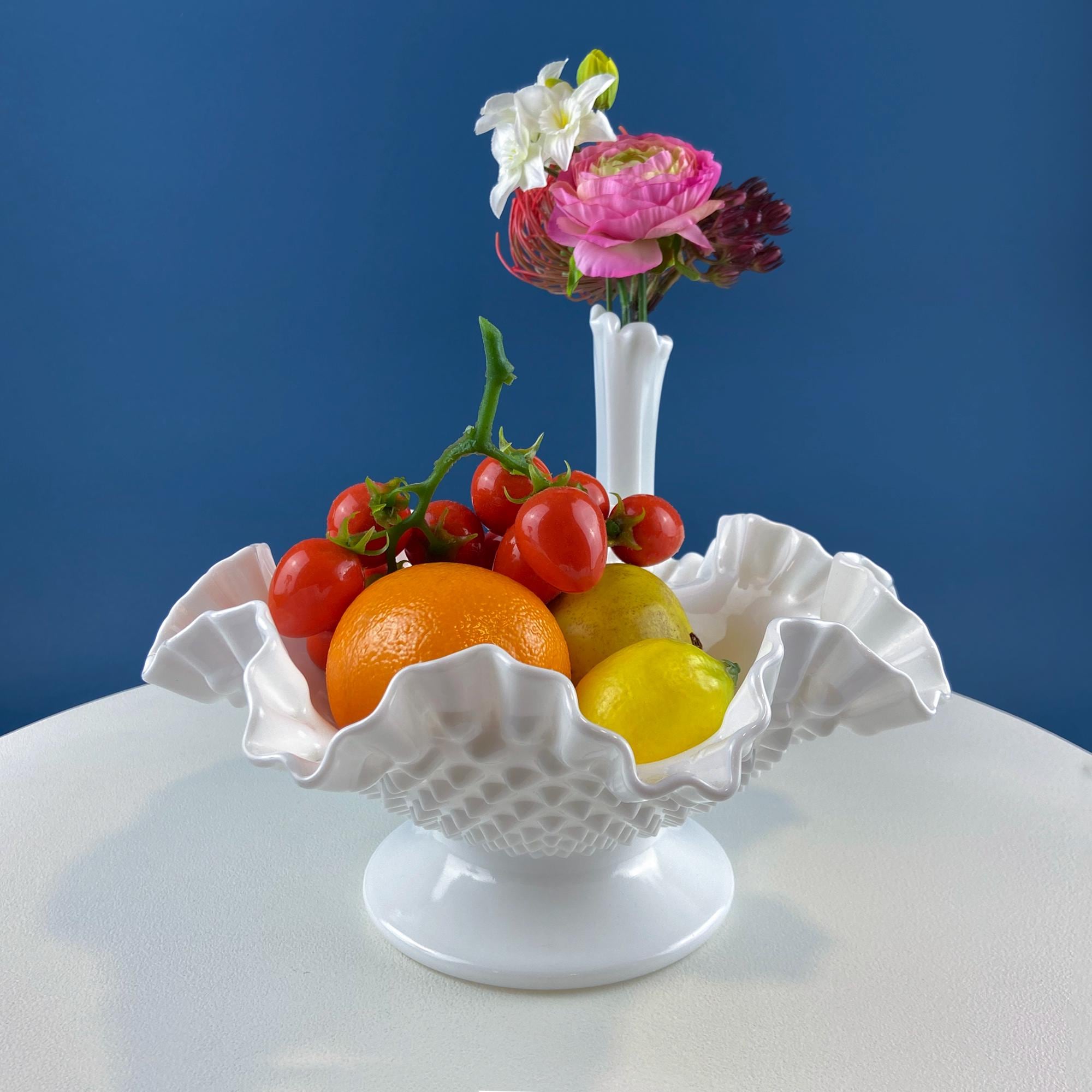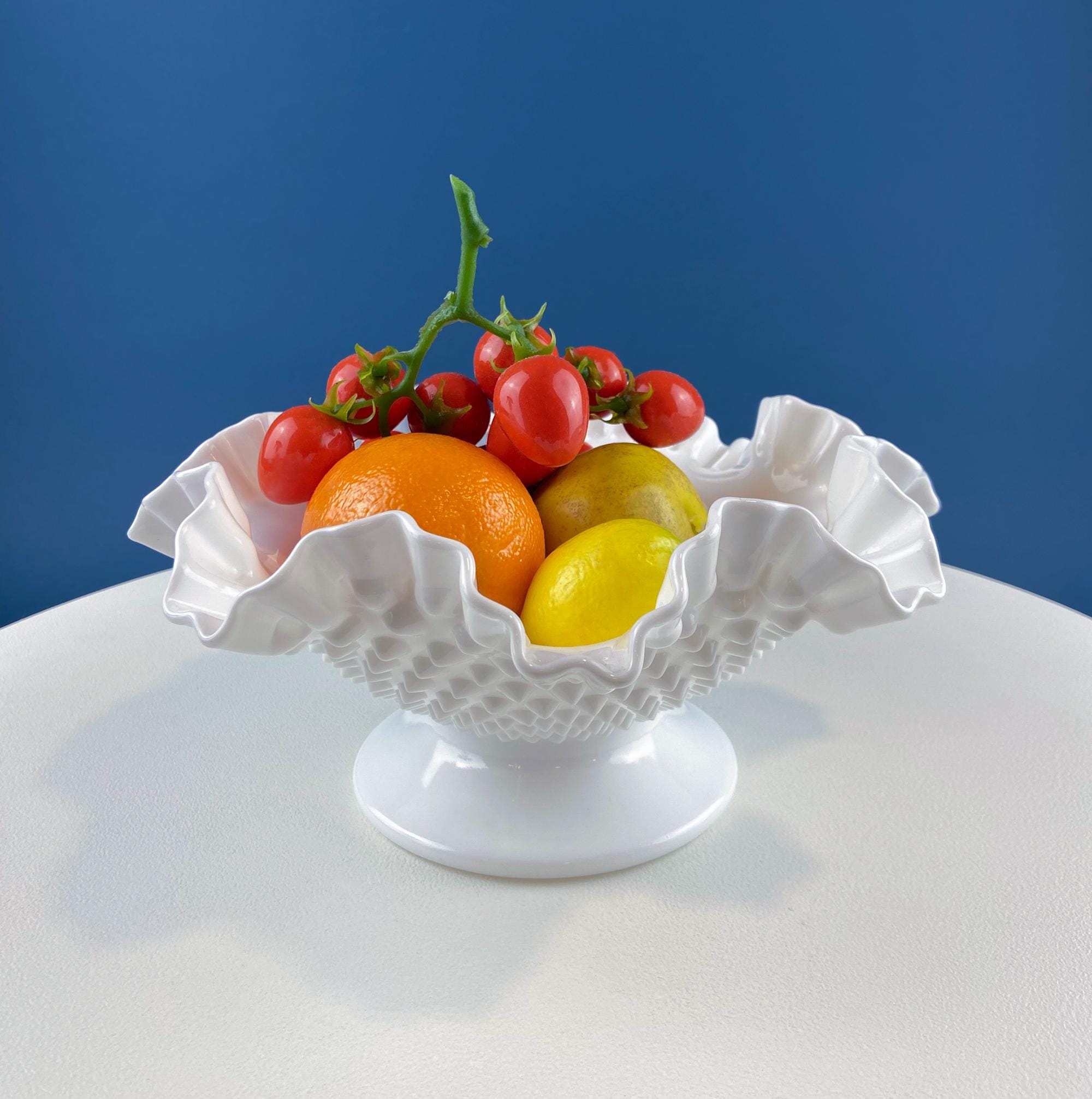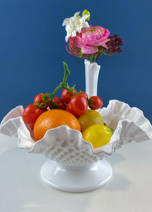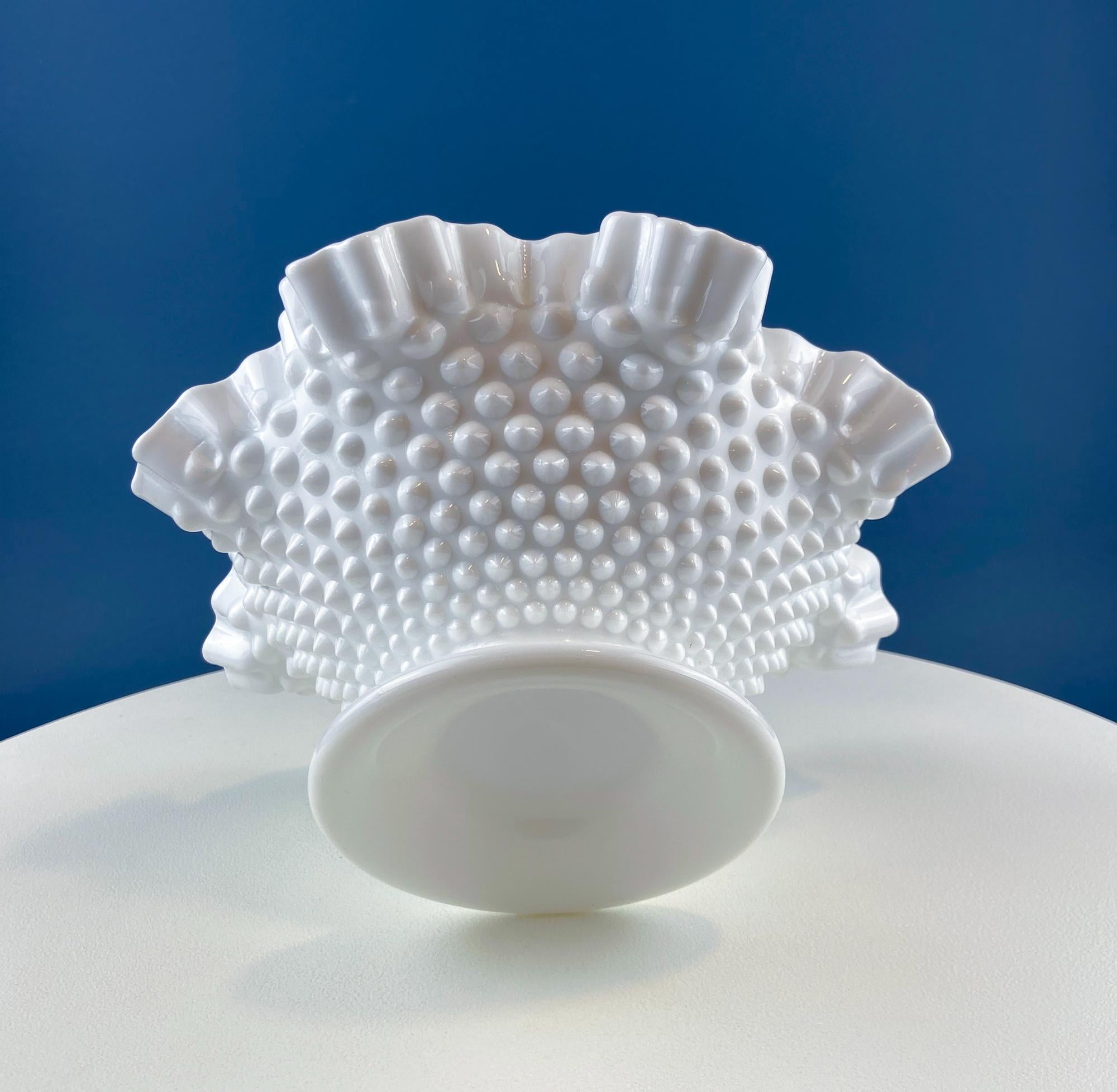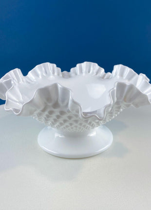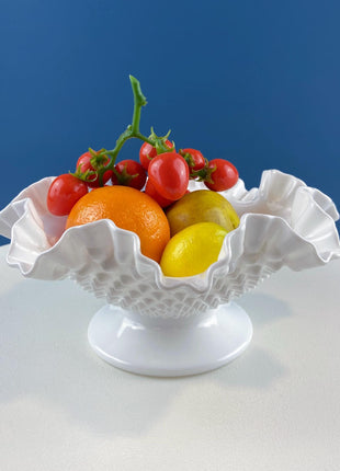 Fenton Milk Glass Hobnail Footed Bowl with Ruffled Edge. Vintage Collectible White Fruit Serving Dish. Dining Room Decor. Table Centerpiece.