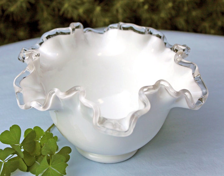 Fenton Silver Crest Milk Glass Bowl. Double Ruffled Scalloped Rim Bowl. Wedding Reception Dish. Extremely beautiful milk glass collectible item.... Read More