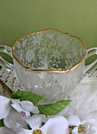 Fostoria Glass Creamer & Sugar Bowl - Chintz Etching Baroque Pattern, Gilded Rims