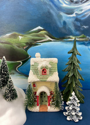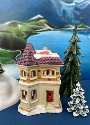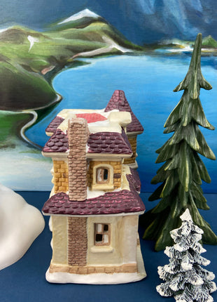 Illuminated Porcelain House. Medium-Sized Rustic Brick House with Red Roof for Christmas Village. Holiday Accessory. Traditional Home Decor