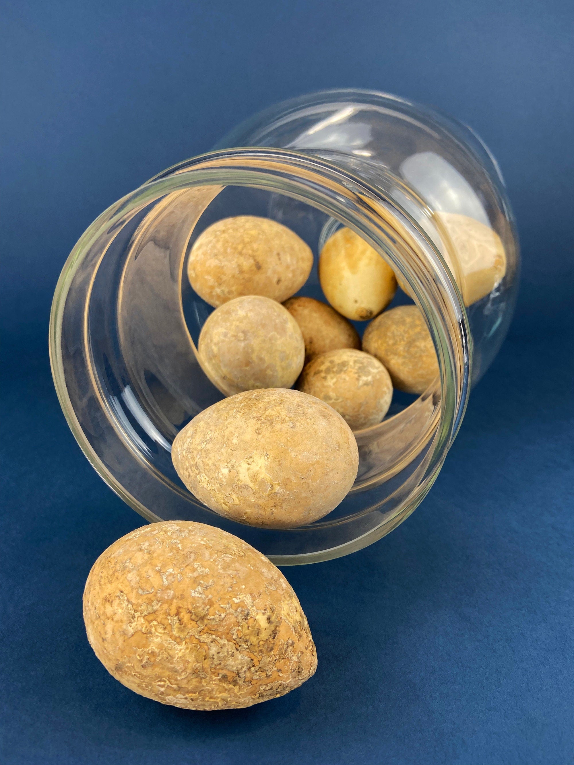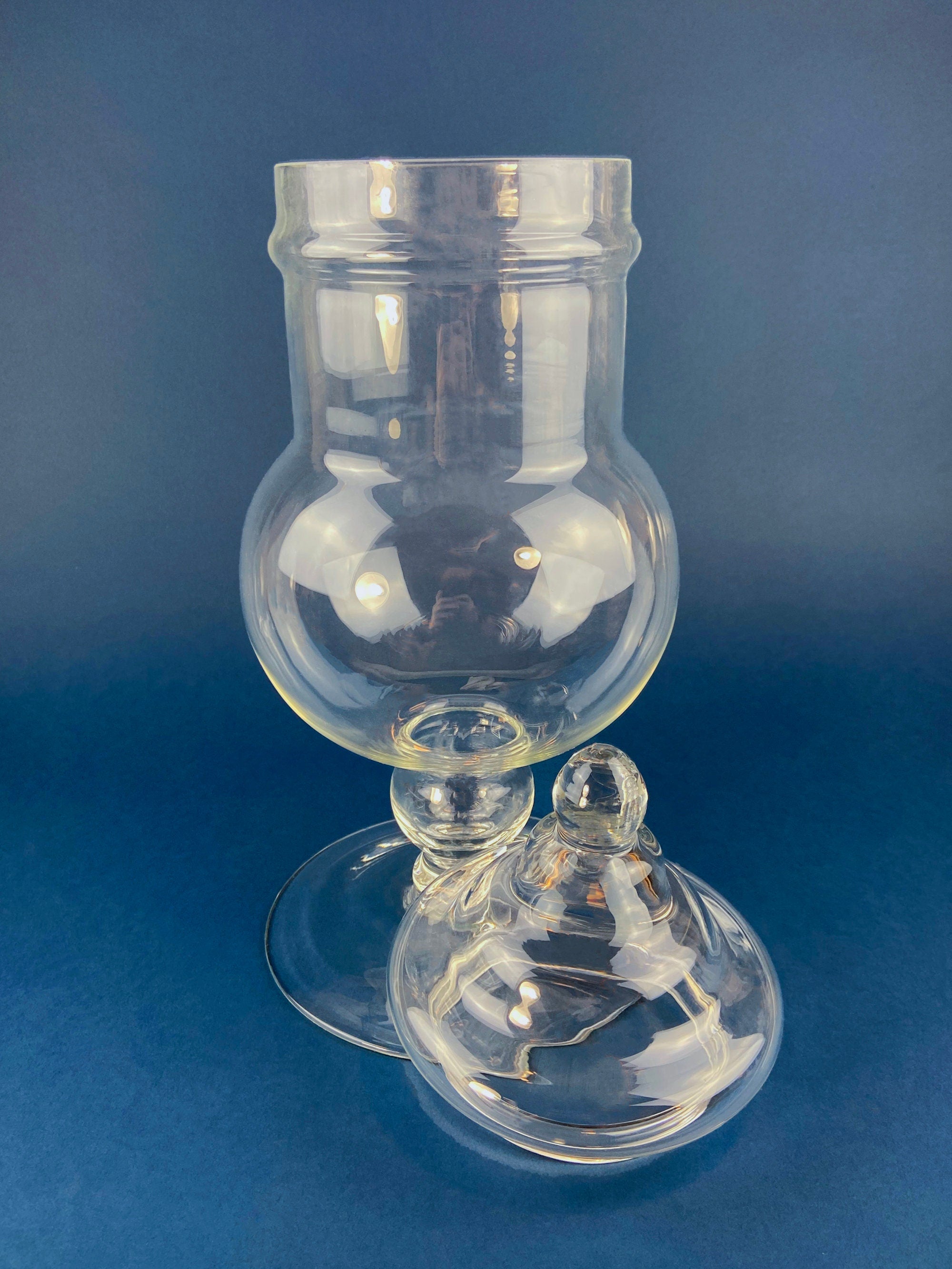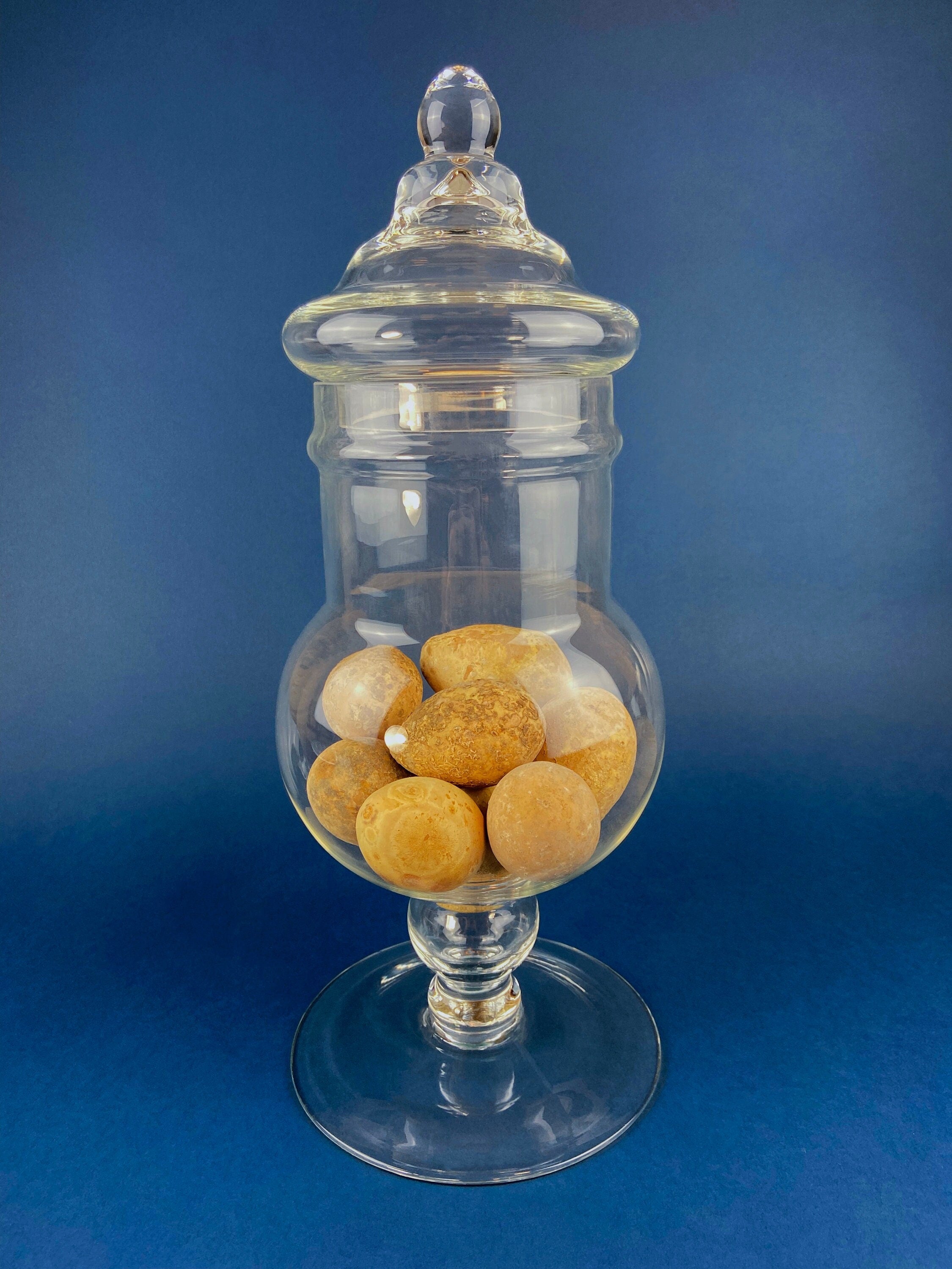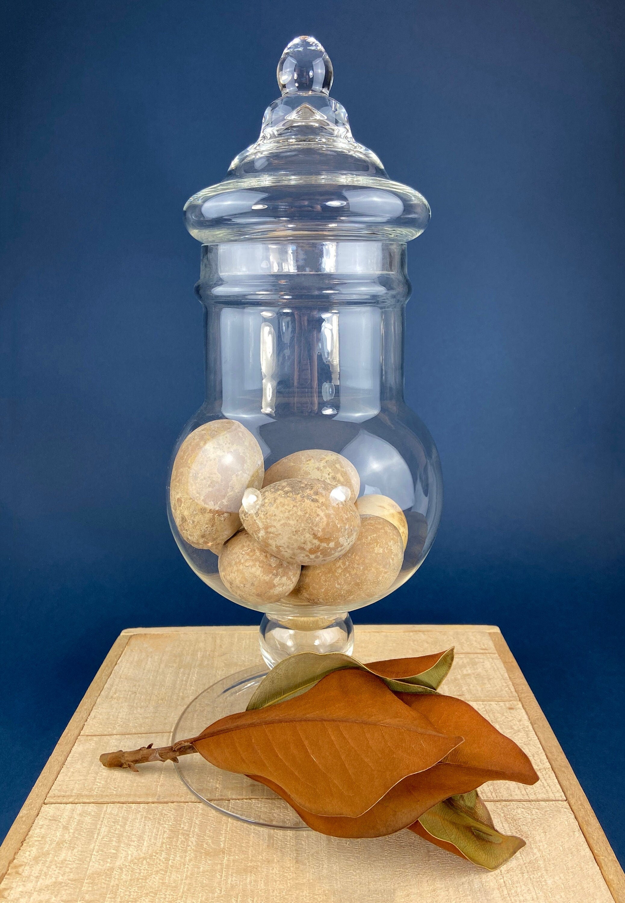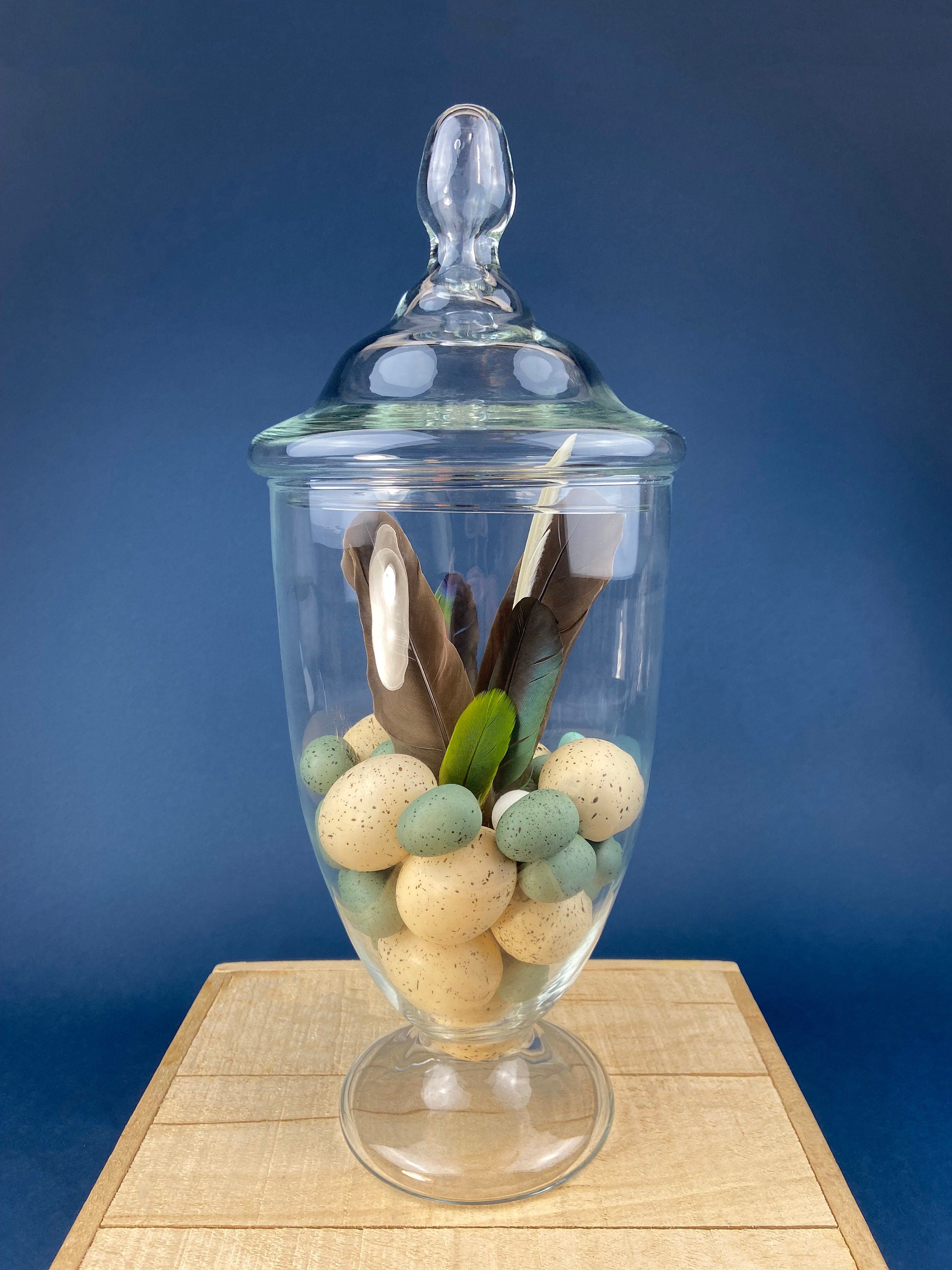 Large Apothecary Jar with Gourd Eggs. Alternative Spring/Easter Decor or Thanksgiving/Fall Display. Footed, Glass Storage Jar with Lid. Terrarium. Table... Read More
