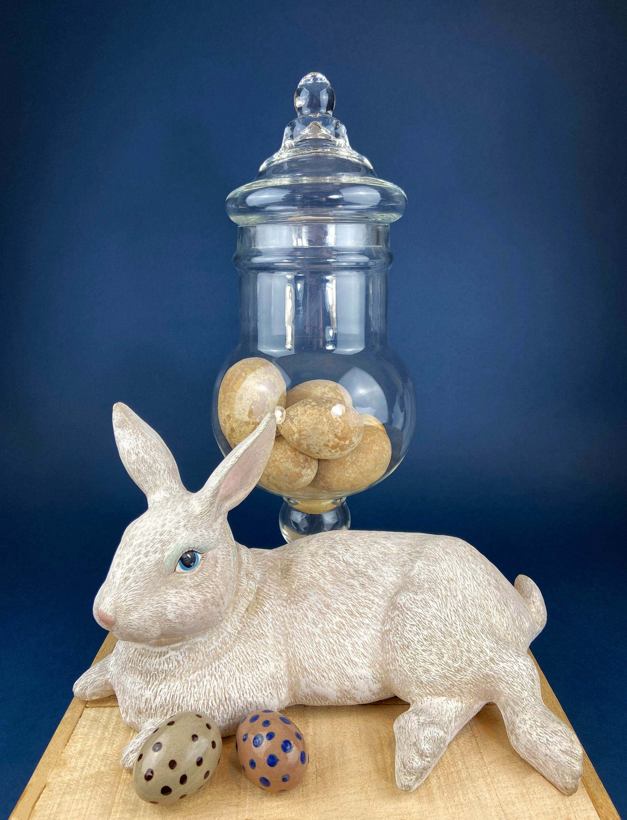 Large Apothecary Jar with Gourd Eggs. Alternative Spring/Easter Decor. Footed, Glass Storage Jar with Lid. Terrarium. Table Centerpiece.