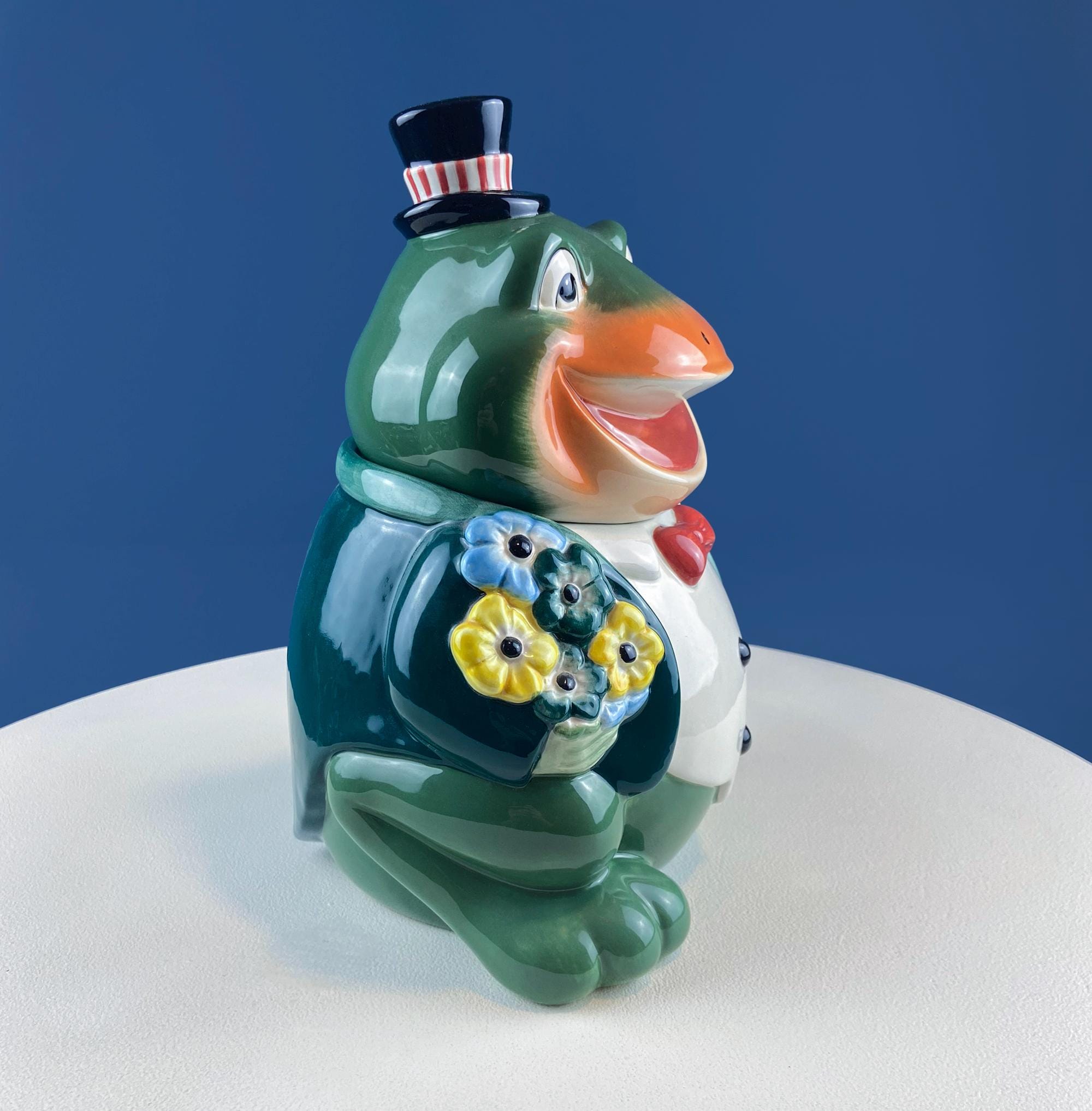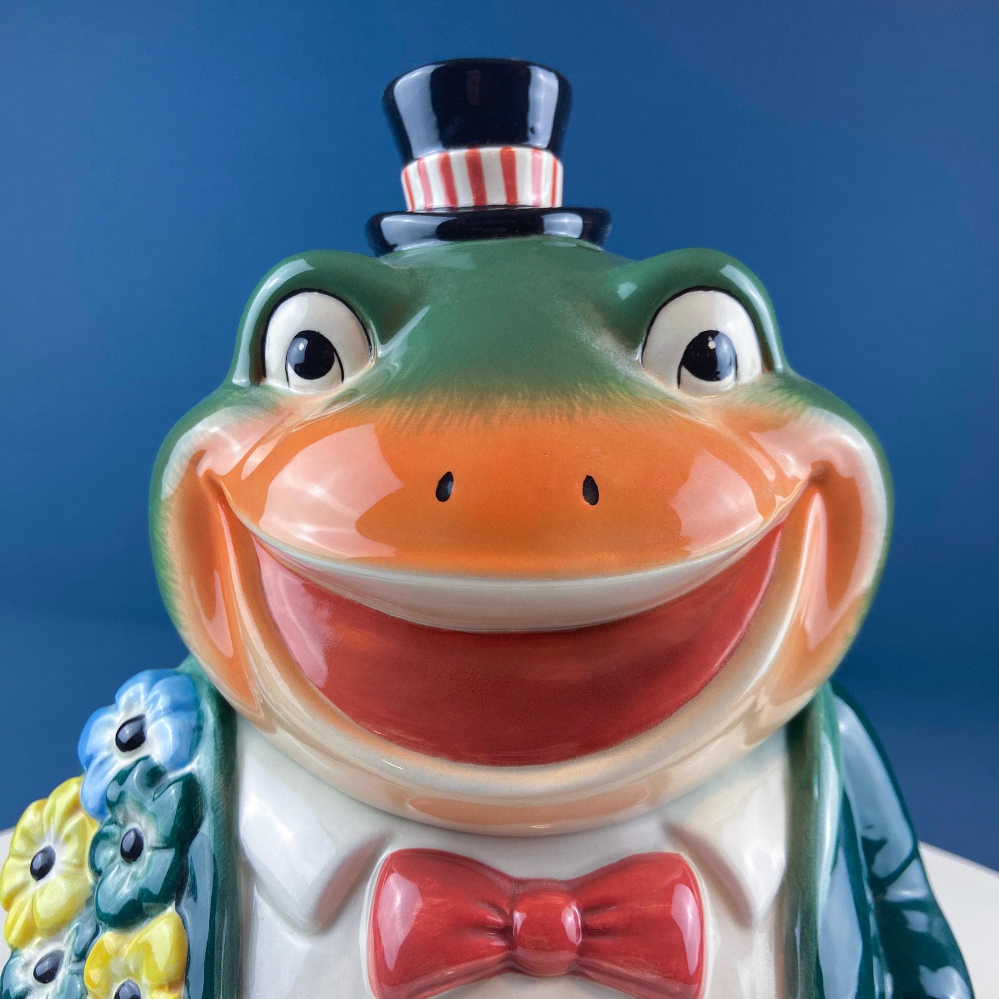 Smiling Frog Cookie Jar by Dept 56. Dapper Toad with Flowers Porcelain Storage Canister. Dining Kitchen Decor. Kids Room.