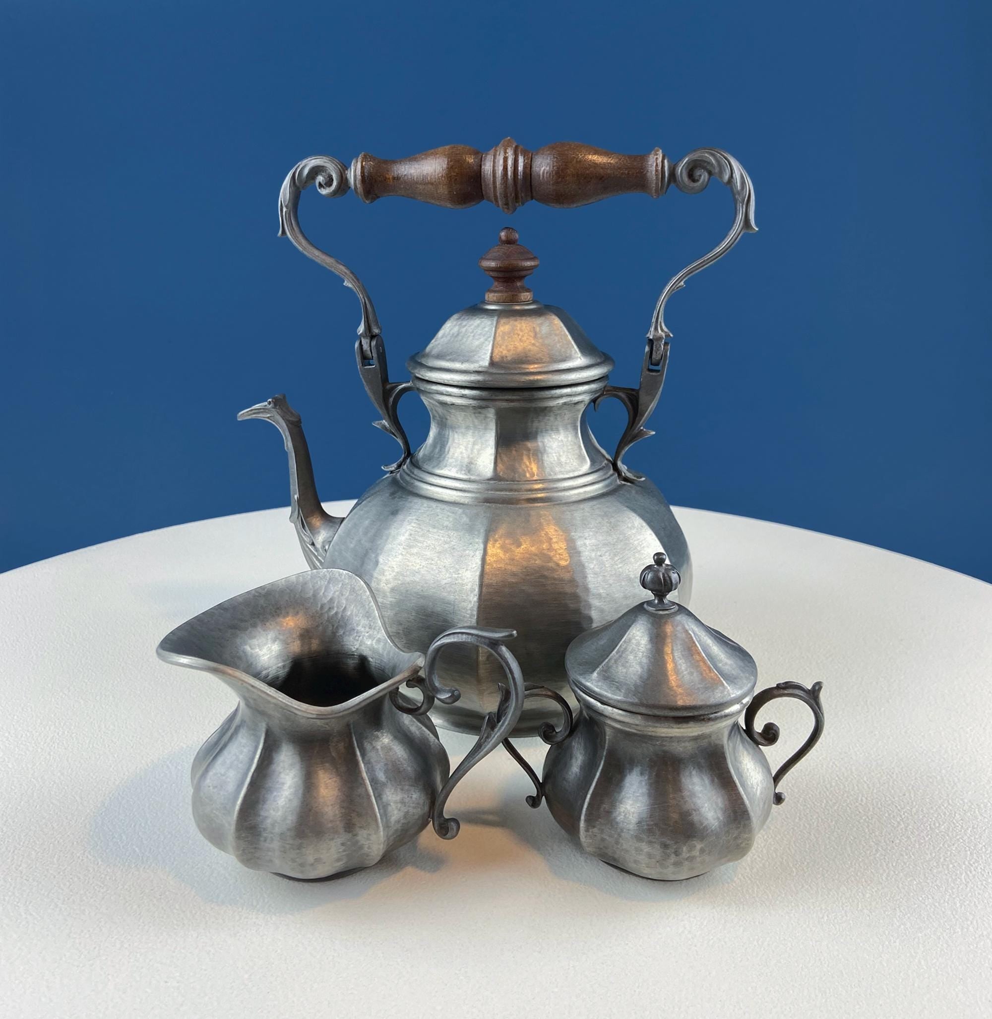 Vintage 6 Piece Pewter Coffee & Tea Serving Set with Filigree Tray. Metawa, Holland. Mid Century Modern and Early Art... Read More