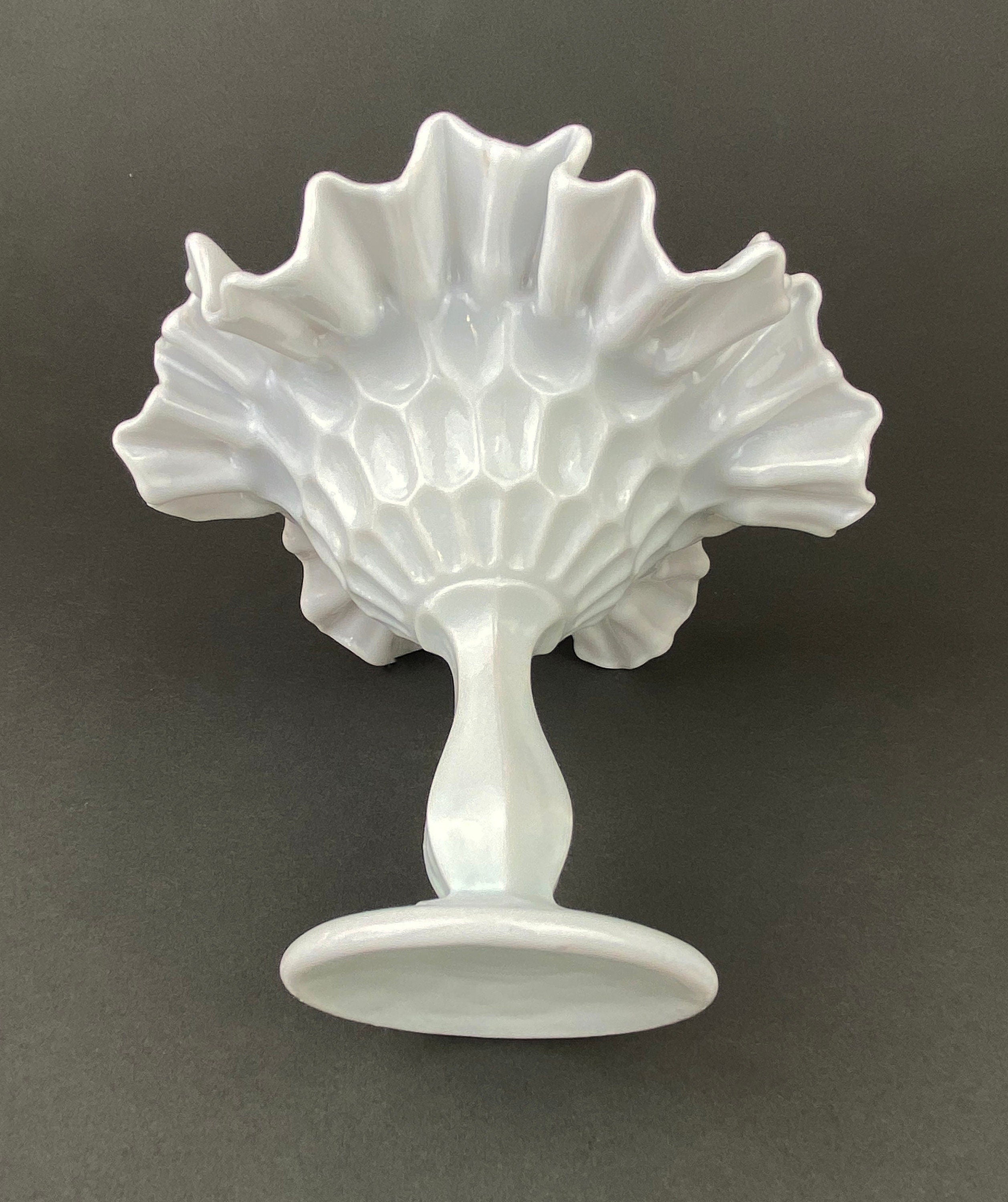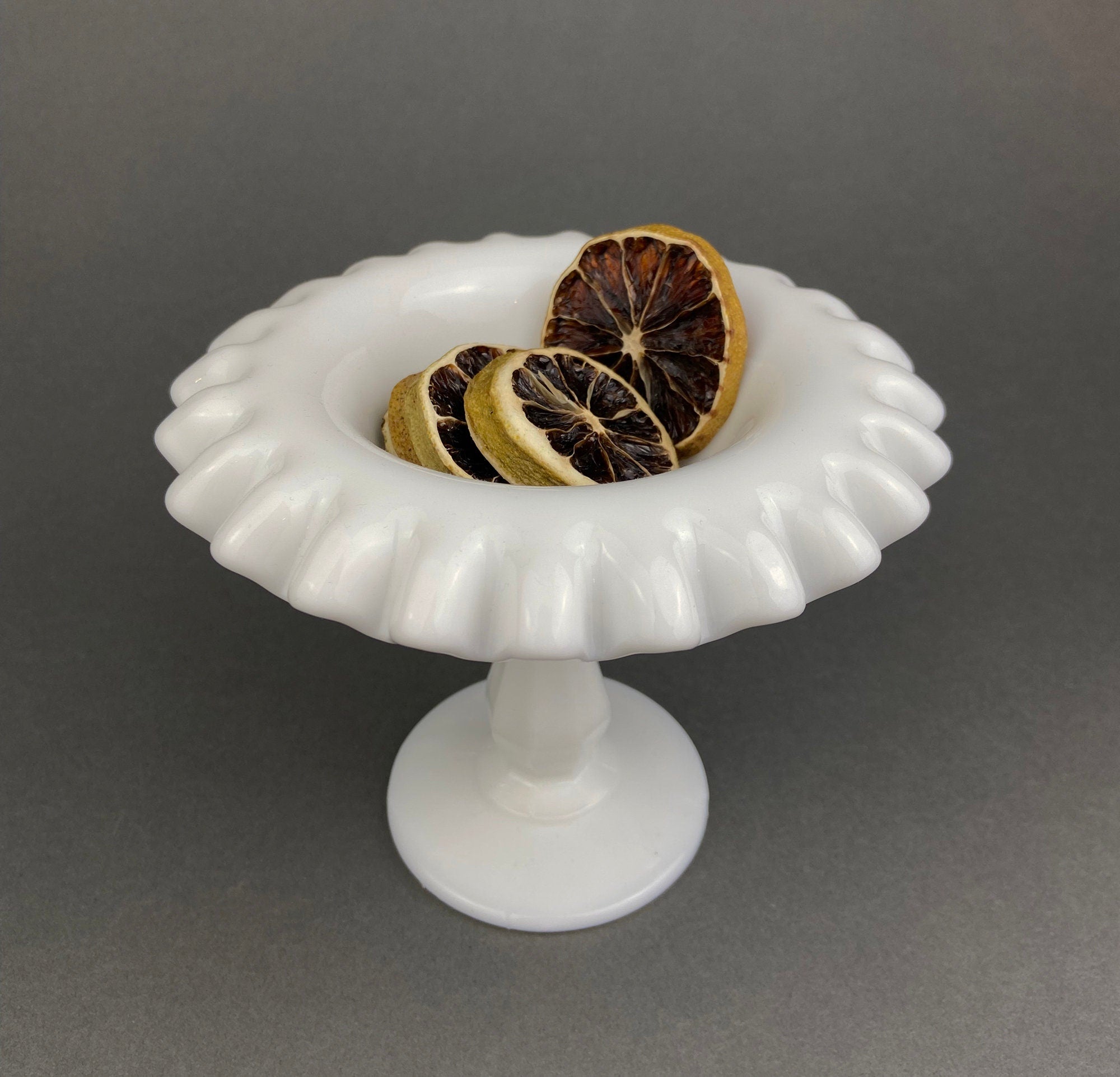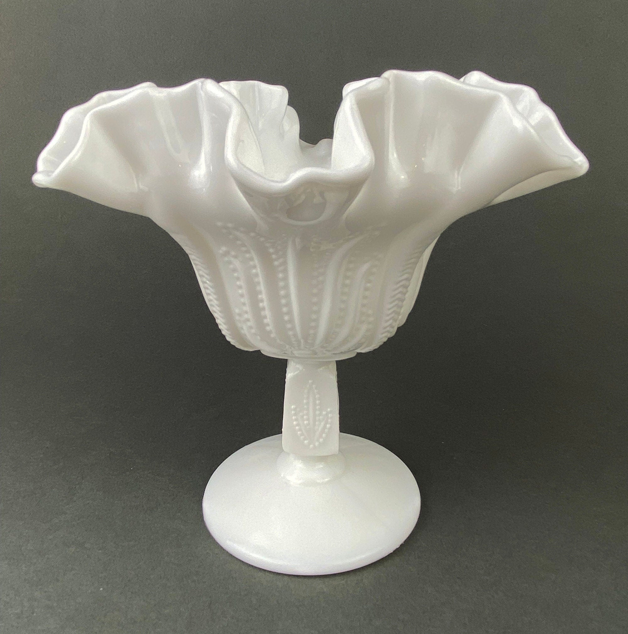 Milk Glass Candy Dish with Ruffled Brim. Vintage, White Trinket Dish. Footed Bowl with Floral Motif. Very good vintage condition.... Read More