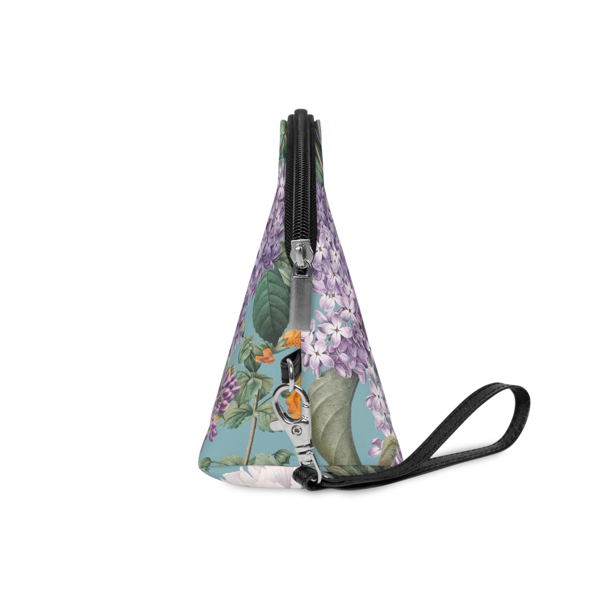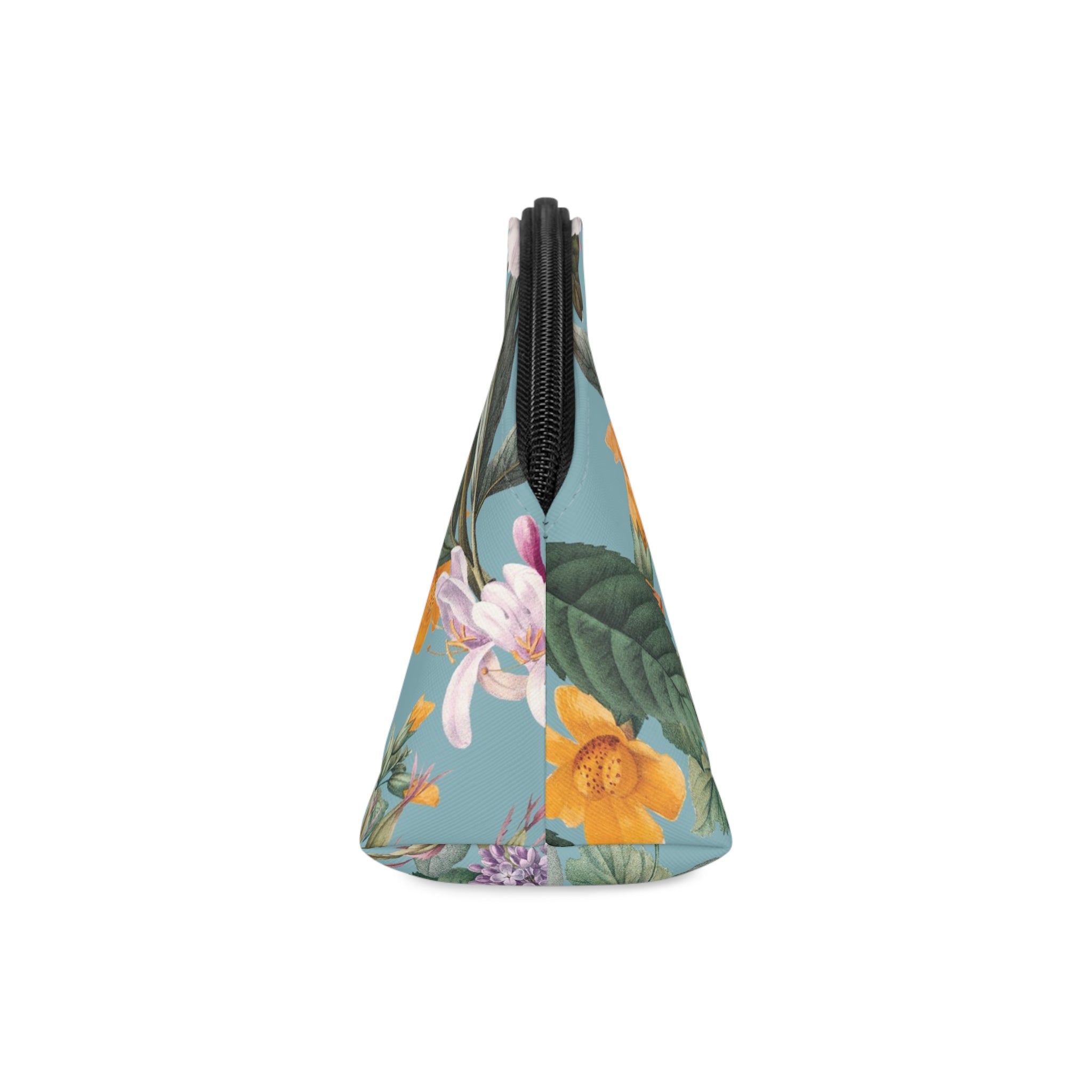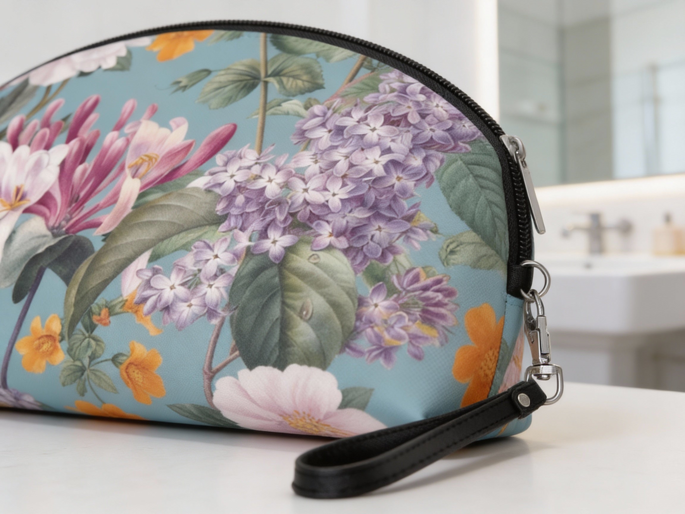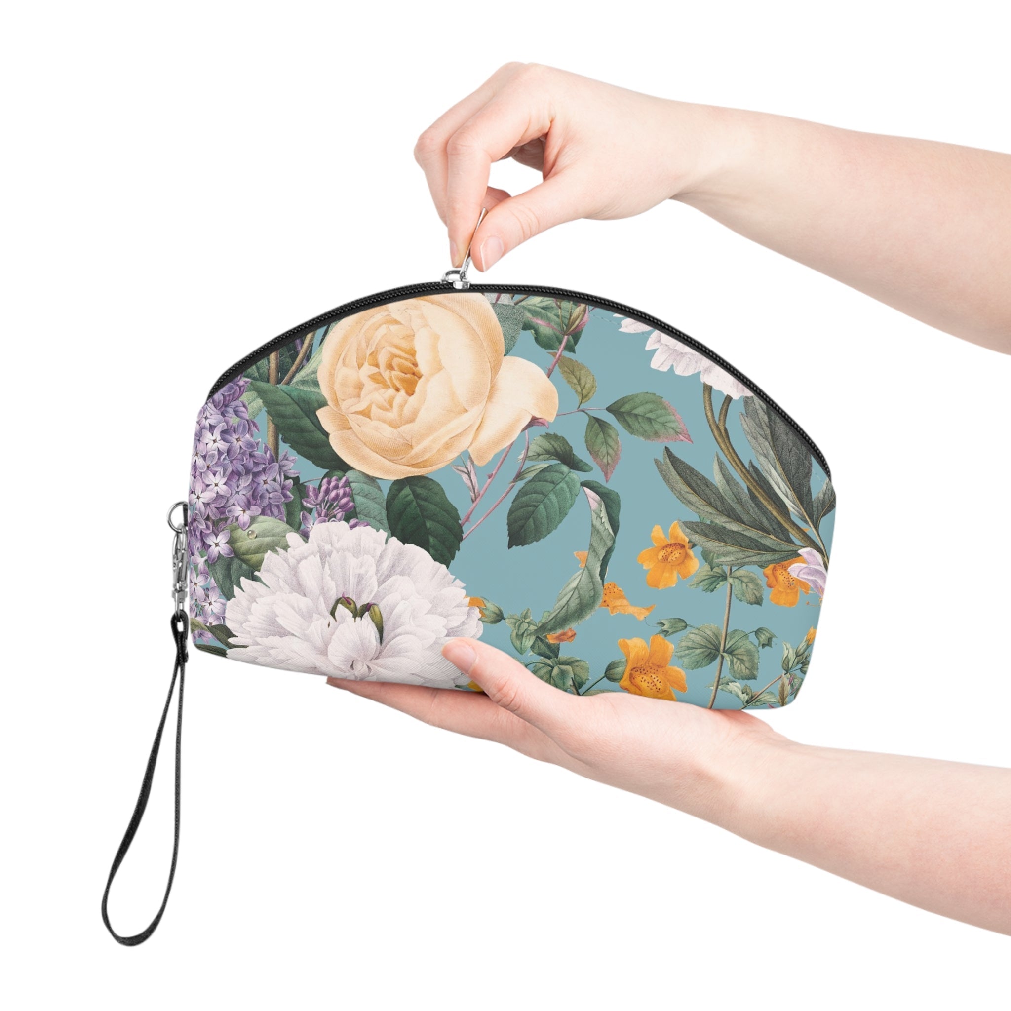A soft-curved makeup bag that brings a vintage botanical scene into everyday moments. The hand-held silhouette slips easily into a tote or sits neatly on a vanity. Fine floral artwork wraps the front and back in saturated, painterly blooms against a muted teal backdrop, giving each glance a quiet, uplifting pause. Smooth PU leather feels luxe without the upkeep, and the black zipper opens to a single roomy compartment for brushes, palettes, and small essentials. The detachable leather wrist strap adds grab-and-go convenience for market runs, weekend trips, or touch-ups between meetings. It’s the kind of piece that turns routine into something a little more beautiful.