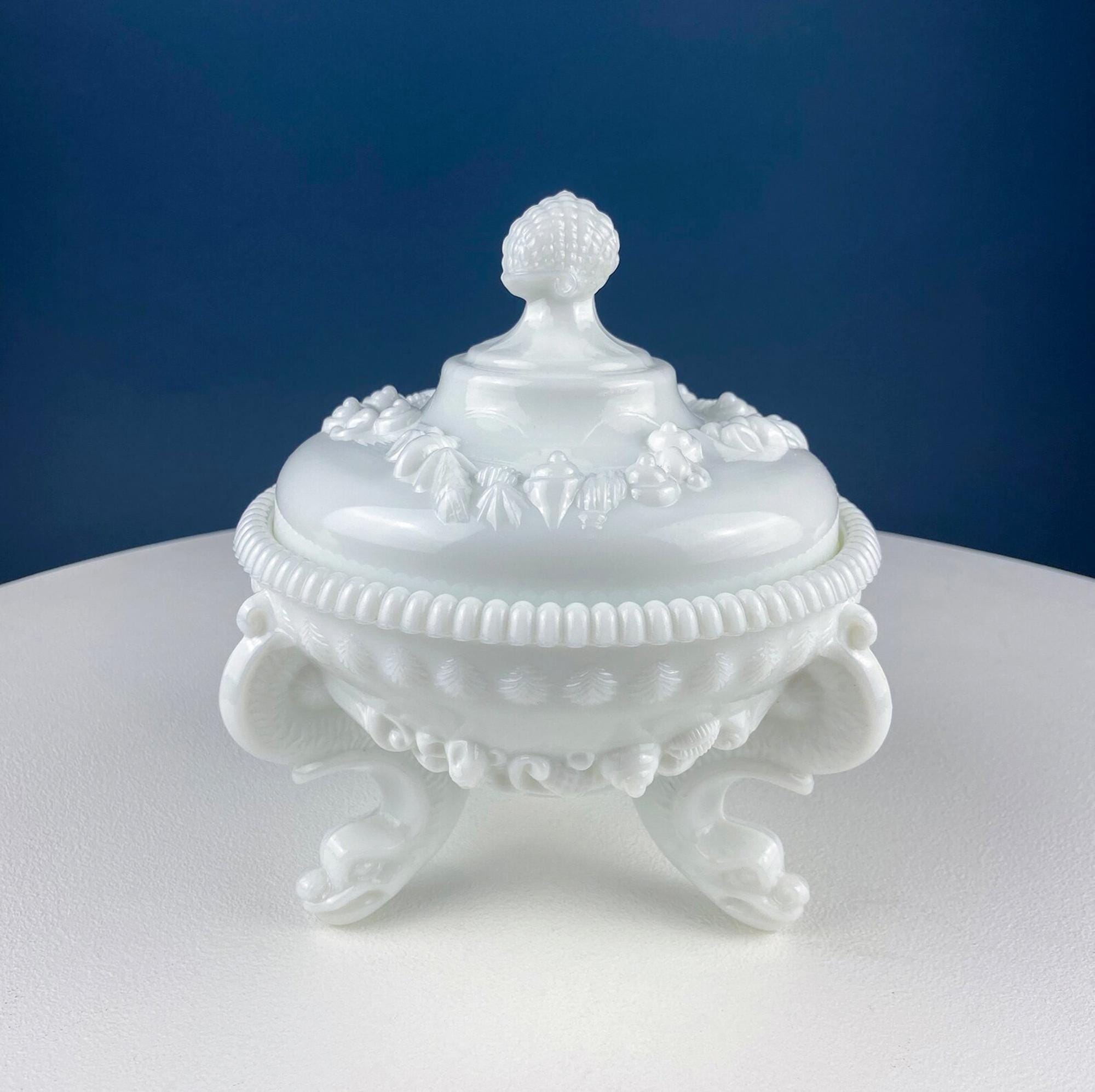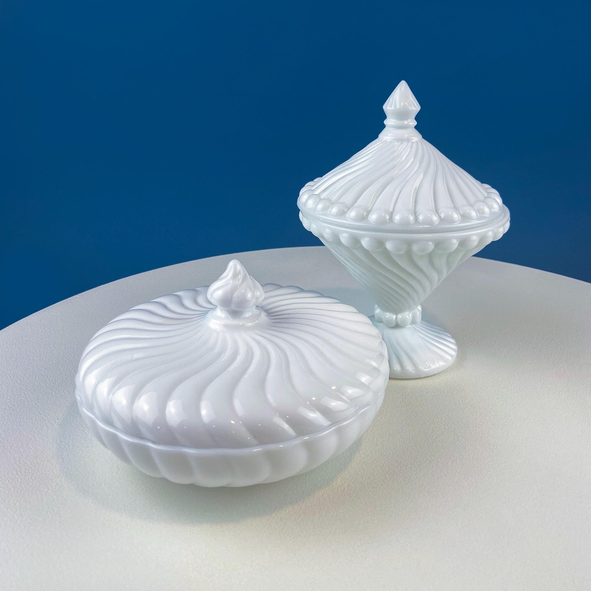 Vintage Milk Glass Set of Bowls with Lid. Swirl Motif. White Dishes for Bath Accessories, Bedroom Jewelry Storage, Candy. Gift for Him Her.