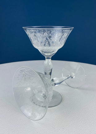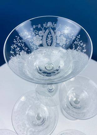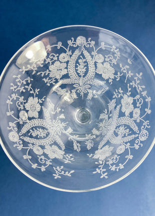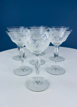 Vintage New Martinsville Tall Sherbet Champagne Glasses. Set of 7 Prelude Etched Stemware. Highly Collectible Elegant Barware. Wedding Registry. This... Read More