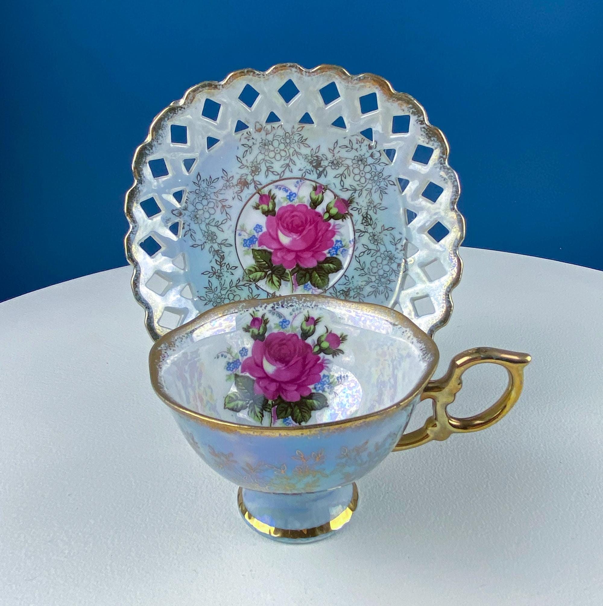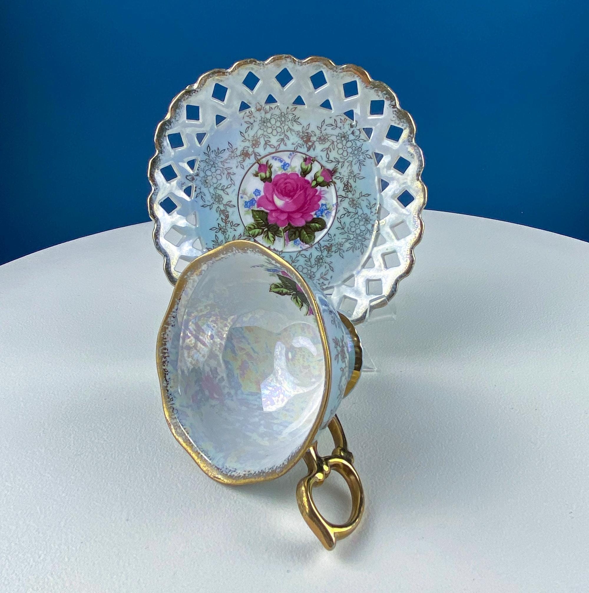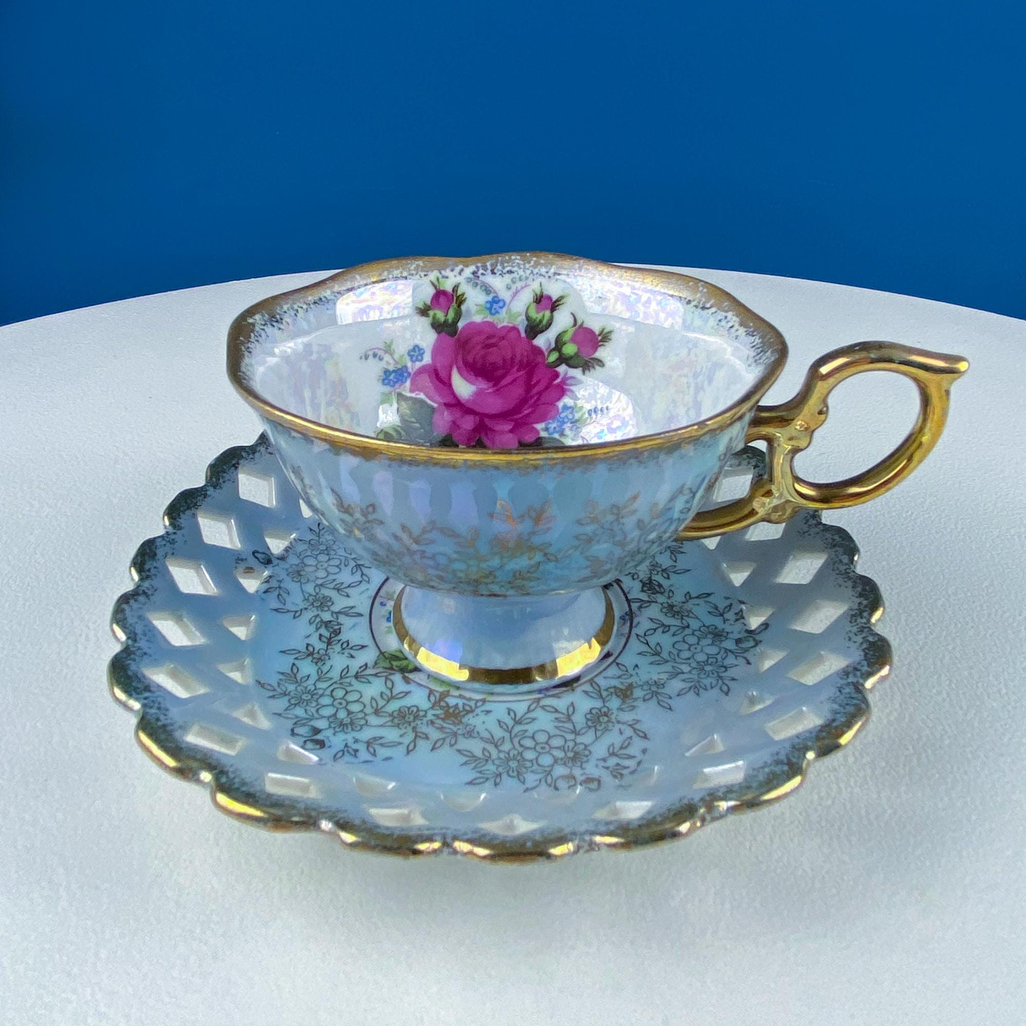 Vintage Pearlescent Blue Cup & Saucer with Pink Rose and Forget-Me-Nots Motif. Reticulated Unusual Square Saucer. Collectible Luster Porcelain Tea... Read More