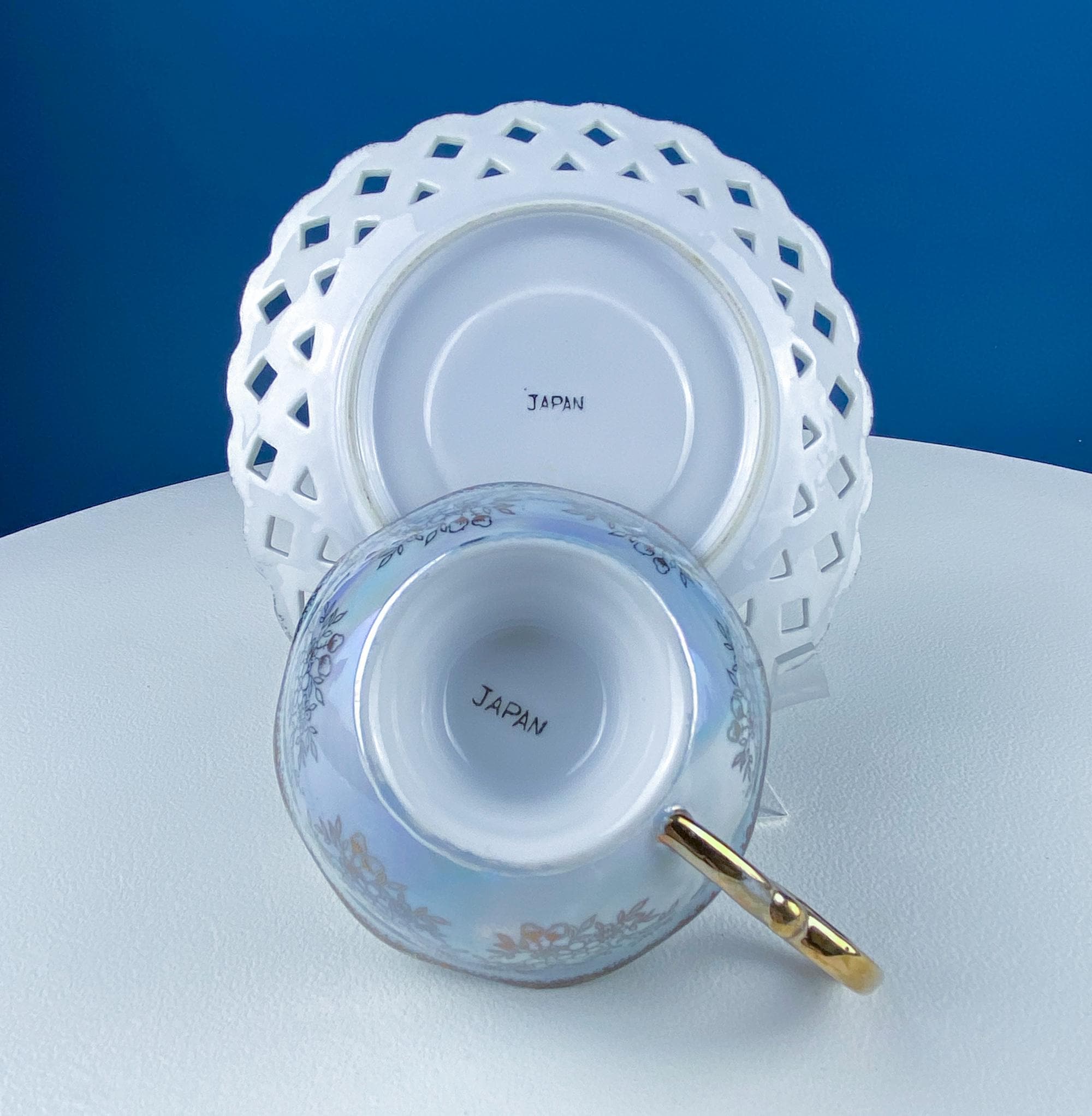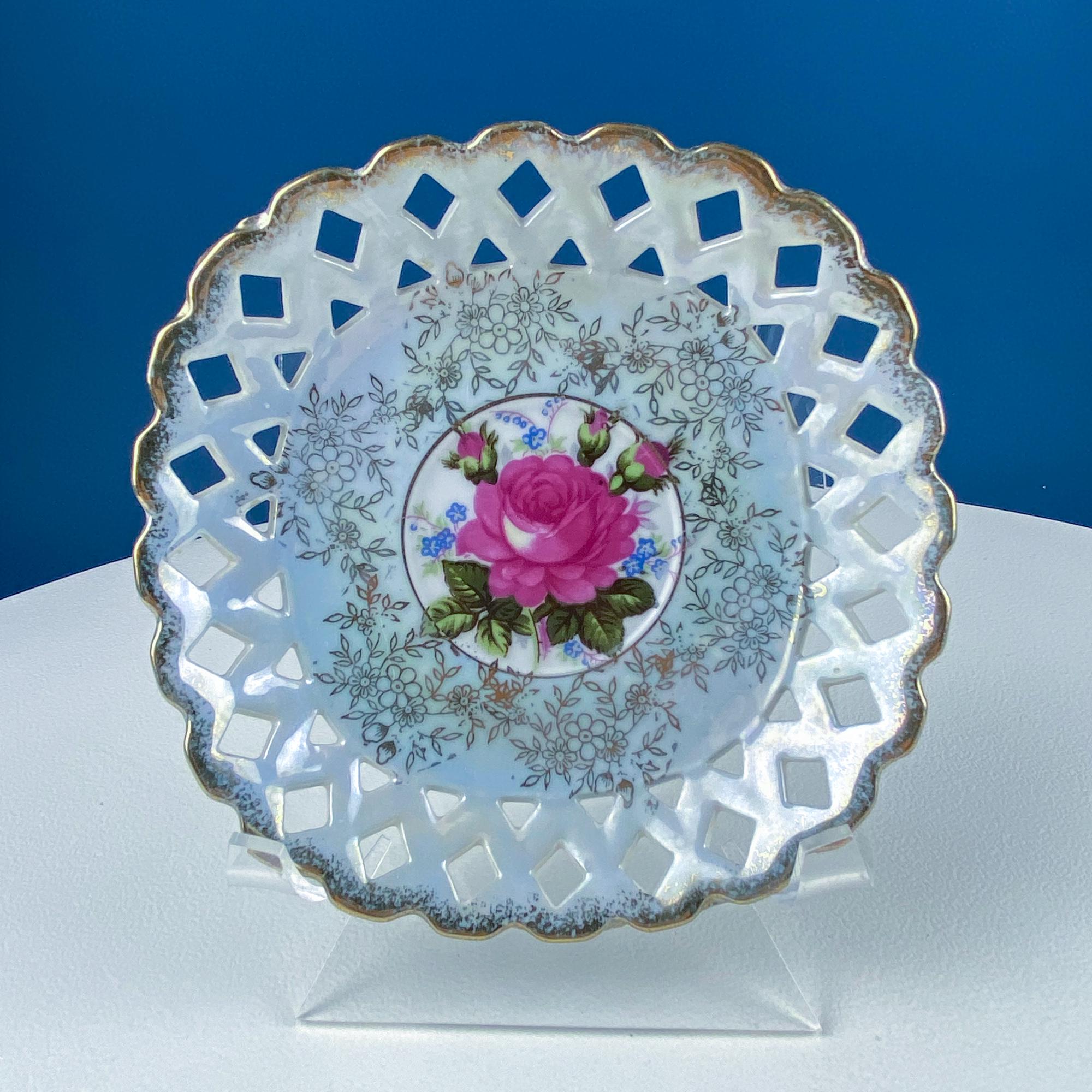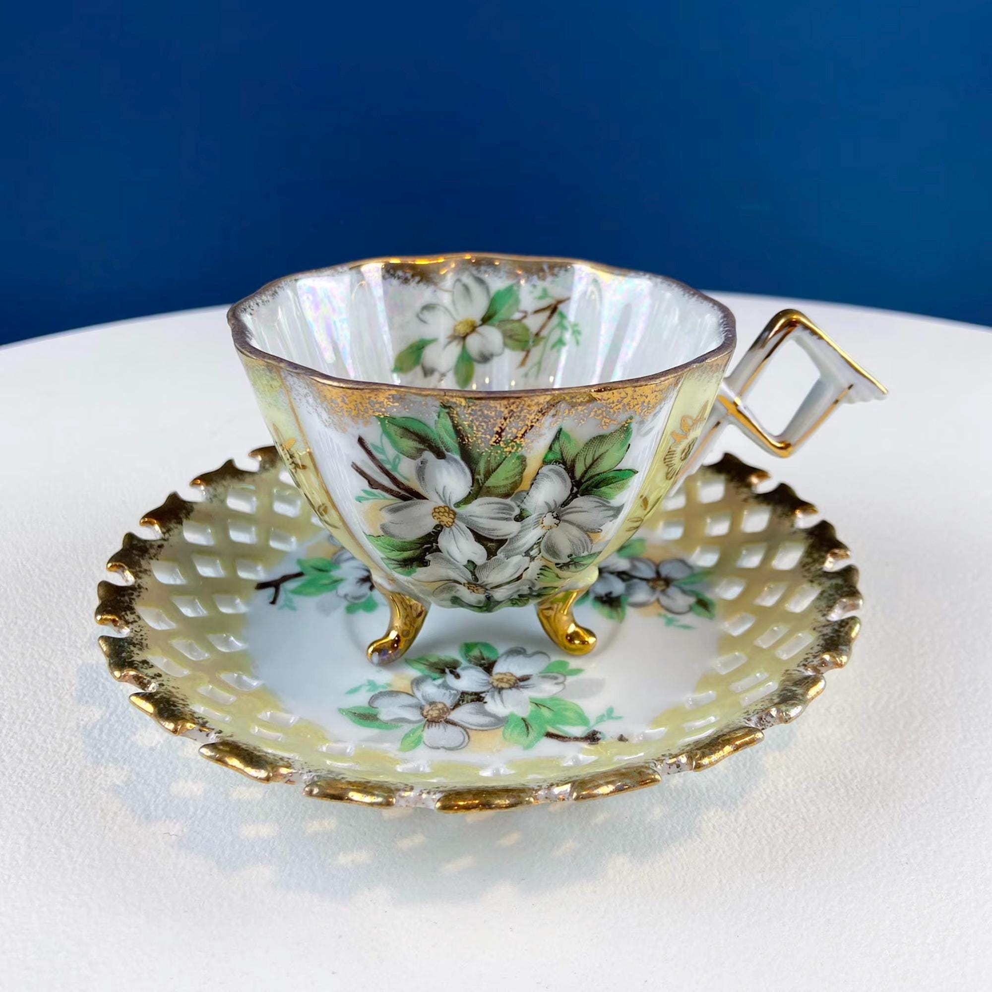 Vintage Pearlescent Blue Cup & Saucer with Pink Rose and Forget-Me-Nots Motif. Reticulated Unusual Square Saucer. Collectible Luster Porcelain Tea... Read More
