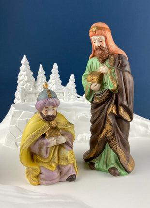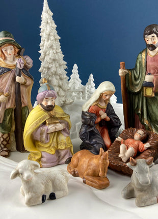 Vintage, Porcelain Nativity Set. Classic Colorful Set of Nine Statuettes. 9" Figurines. Seasonal Christmas Display. Beautifully Detailed Collectibles. Good Condition.... Read More