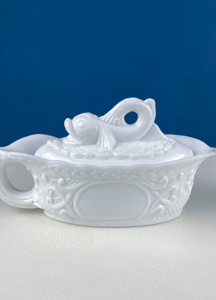 Westmoreland Milk Glass Lidded Serving Trinket Bowl with Dolphin and Celtic Motifs. White Covered Dish Storage Container for Bath Products.